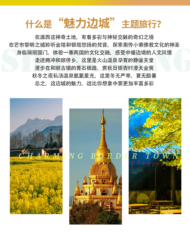 3、门票:行程内所列景点门票(芒市大金塔、大银塔、一寨两国、和顺古镇、热海景区含电瓶车、银杏村含电瓶车/高黎贡油菜花基地/火山景区3选1);