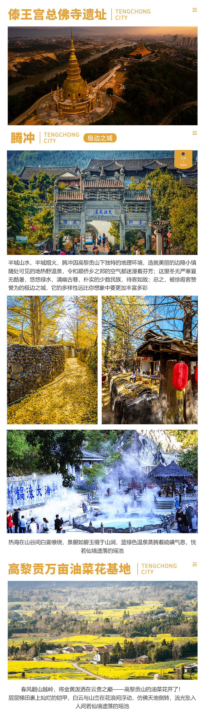 温馨提示:银杏黄叶季节为11月-12月中期,高黎贡油菜花季为2-3月份(两者因季节和天气变幻会有一点偏差),其它季节我们将以腾冲火山景区作为替代景点,敬请知悉
