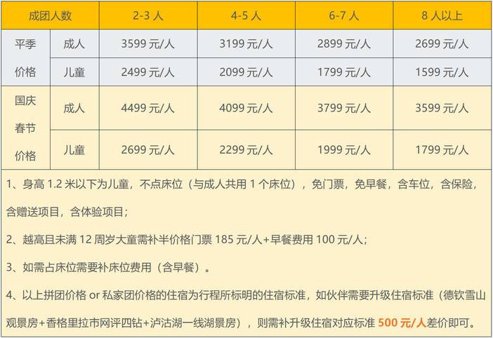 ▷房差:自然拼房2-3人标准间,如不愿拼房或拼不了房者须补单房差(平季600元/人,暑期1000元/人,国庆/春节1500元/人);