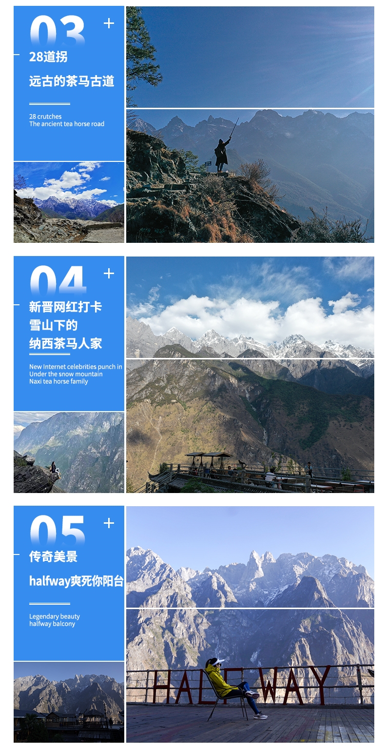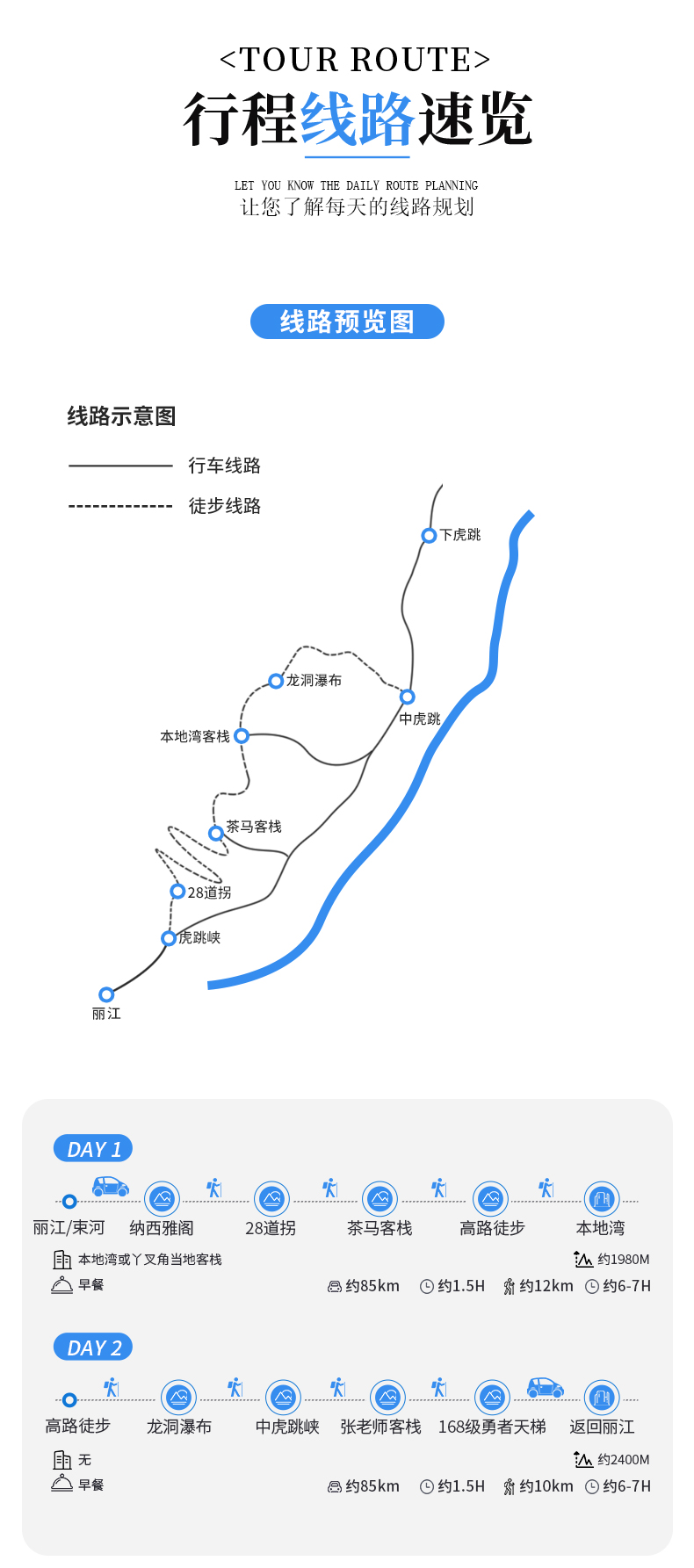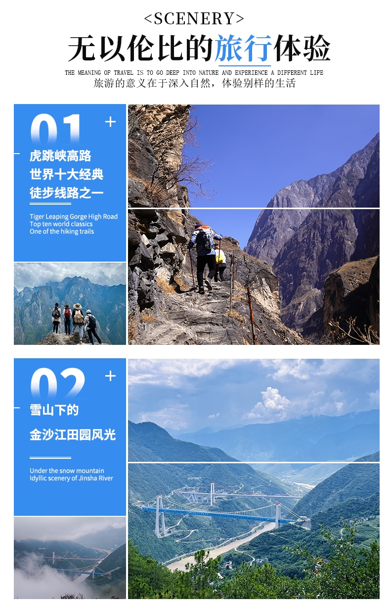 早上丽江古城/束河古镇接人(提前一天晚上9点前会通知大家第二天具体出发时间),接人后从丽江乘车出发,约1.5小时抵达虎跳峡镇,进入景区由虎跳峡高路徒步路口。领队带领大家热身运动后开始徒步,高山峡谷,藏地天堑,近距离感受金沙江“超级山洪”的威名;走在悬崖上的羊肠小道,体验虎跳峡极致的峡谷风情。中午在纳西雅阁餐厅午餐,随后翻越著名的二十八道拐,抵达茶马古道客栈休息,歇歇脚,在此处面朝玉龙雪山群峰,俯视雪山下的虎跳峡峡谷,景色无比震撼。随后继续前行,约2小时抵达今天我们的终点【本地湾】,傍晚入本地湾当地特色客栈。打卡传奇美景"halfway"爽死你阳台,欣赏雪山落日余晖下的诗意栖居,让眼睛和心灵在震撼后找到柔软歇息。