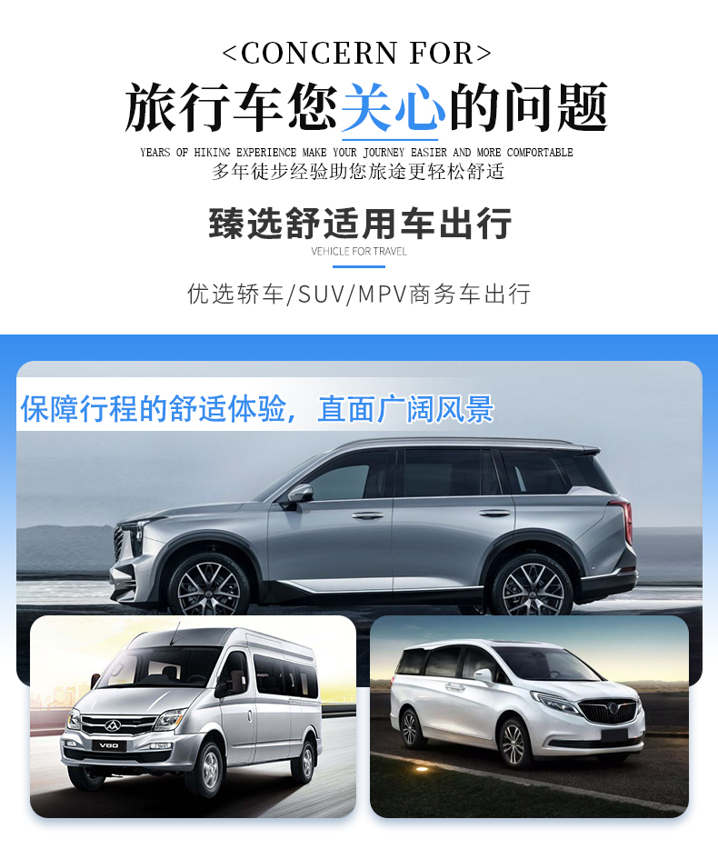 1、交通:行程中旅游包车费用,油、路、桥费,5-19座用车,保证一人一正座;