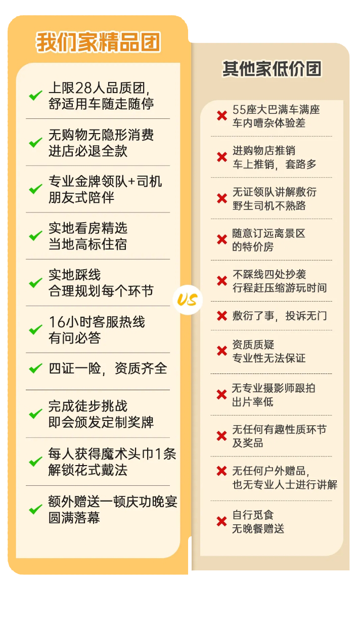 纯玩旅途是底线!我们拒绝任何需购物的套路和隐形消费,给予每-位同行朋友欢乐无顾虑的畅玩感受。(但部分景区内有购物点属景区自身行为,非我司安排,请您谨慎消费!)