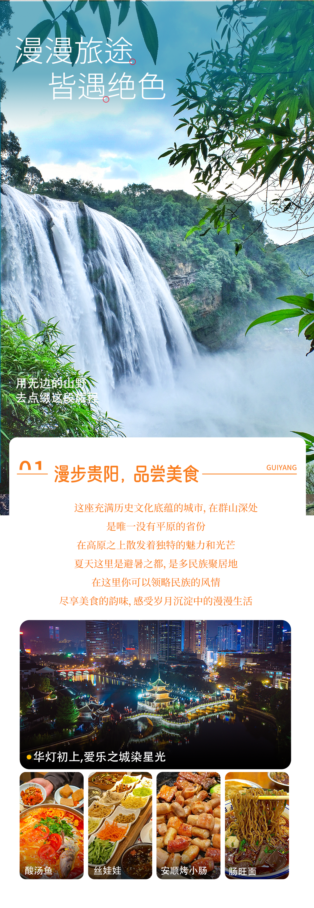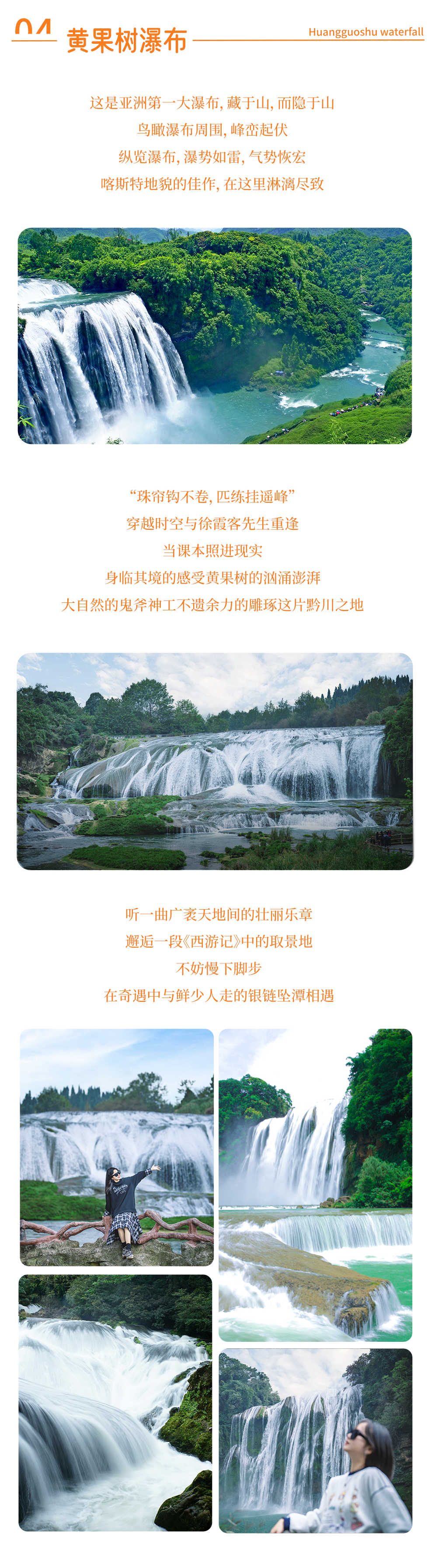① 当天游览时间较长且路况以台阶为主,请穿舒适的运动鞋;黄果树景区内餐厅较少,沿途有较多服务区可以简单解决午餐,如个人有特殊要求可自行携带适量干粮食品备用。