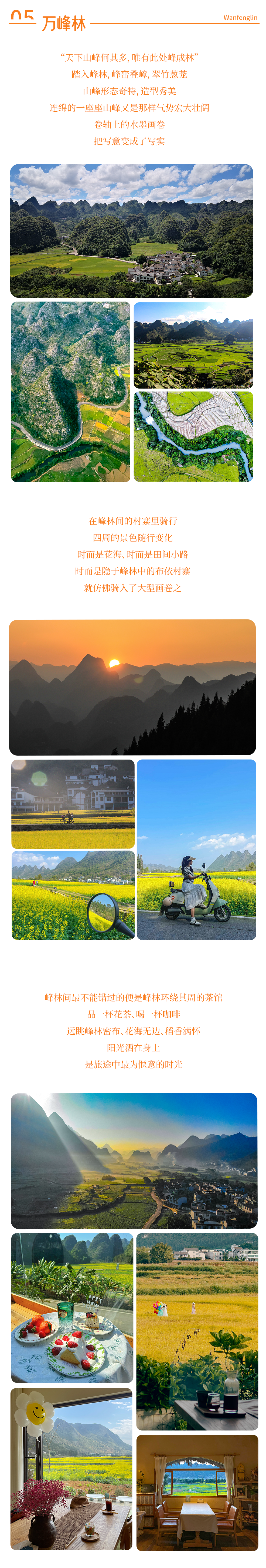 ① 当天行程相当的休闲,大家如有租电动车骑行请注意安全,务必带好头盔;万峰林内美食及咖啡馆众多,大家可根据自己的喜好选择