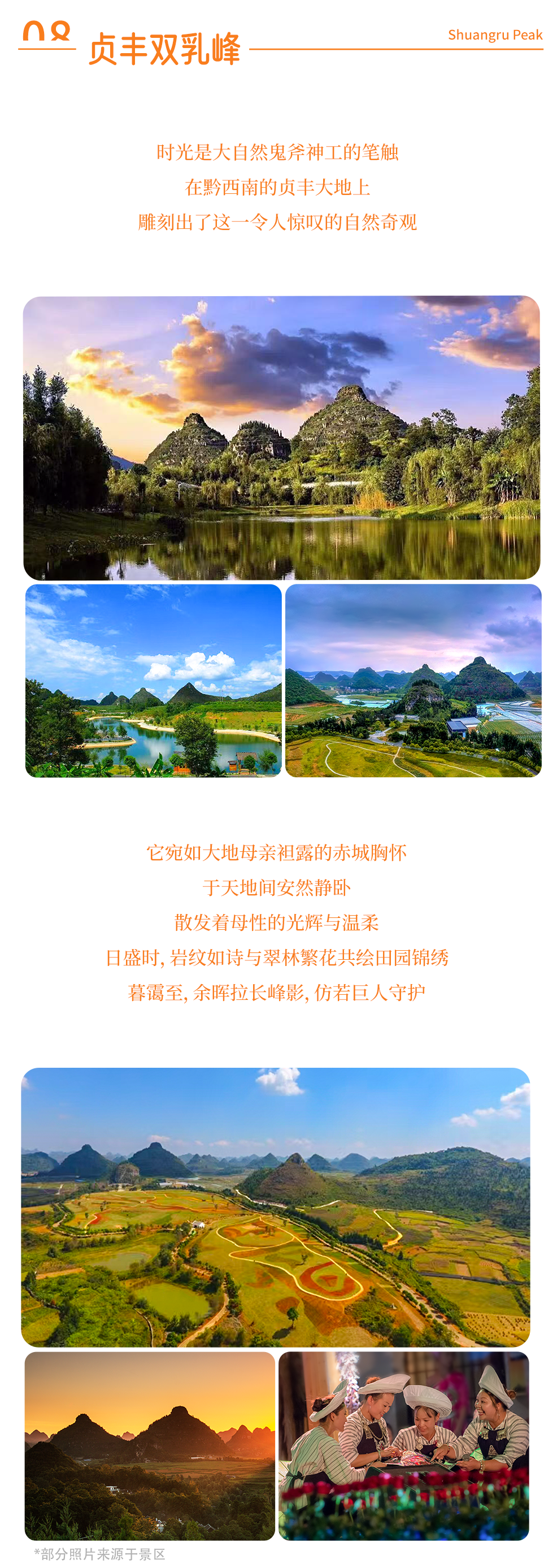 早餐后前往万峰林景区,我们用最轻松的方式打开万峰林,乘坐景区观光车游玩在景区观光道上,看远处峰峦叠嶂,近处田园风光。随后我们留出了足够的时候让大家深度体验万峰林里美丽的布依族村寨,可以租一台电动车游走在田野之间,又或者寻一家安静的咖啡馆静静的享受这静谧时光,有兴趣的话还可以去打卡《爸爸去那儿》同款蛋炒饭。