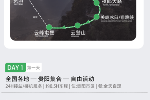 大家根据出发地的高铁动车/航班时间抵达【贵阳龙洞堡机场、贵阳北站、贵阳东站、贵阳站】。我们提供24小时接机/接站服务。车次时间不限,随到随接,早到早玩。