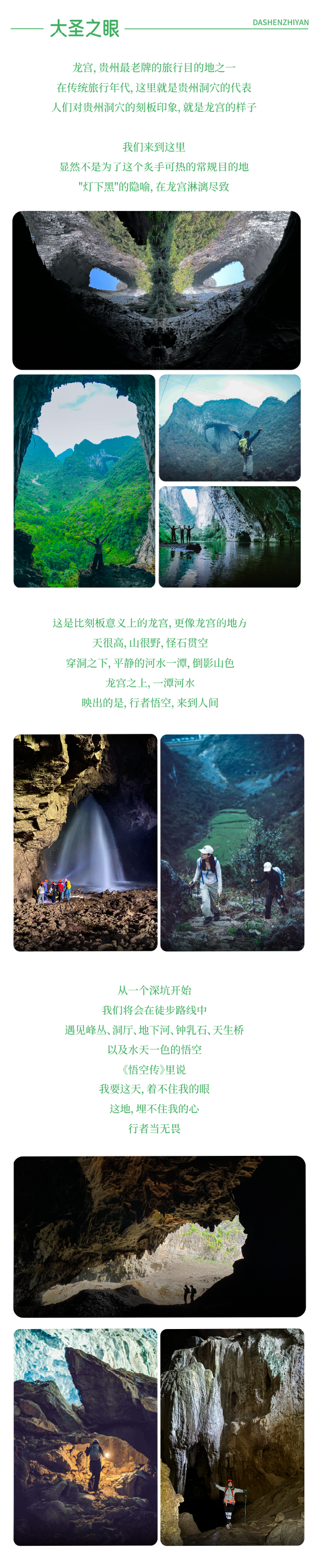 下午走出溶洞继续翻越天坑谷地、乱石坡、灌木林前往第二处地下河、看大圣之眼、凹造型拍美照、看穿洞,随后出山沿乡道返回起点,乘车前往安顺市区入住酒店,结束当天的徒步行程。