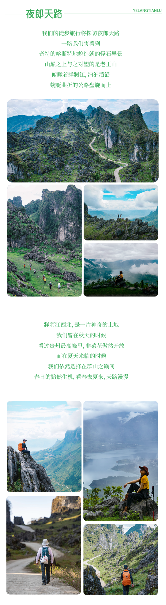 早餐后乘车前往夜郎天路,从山脚的乡道开始徒步,穿越村落、山脉、一路沿着羊肠小道爬升至海拔两千多米的龙脊山顶,沿途眺望牂牁江和老王山做伴。登顶后沿着“异域星球”般的山峰继续前行、拍美照凹造型。