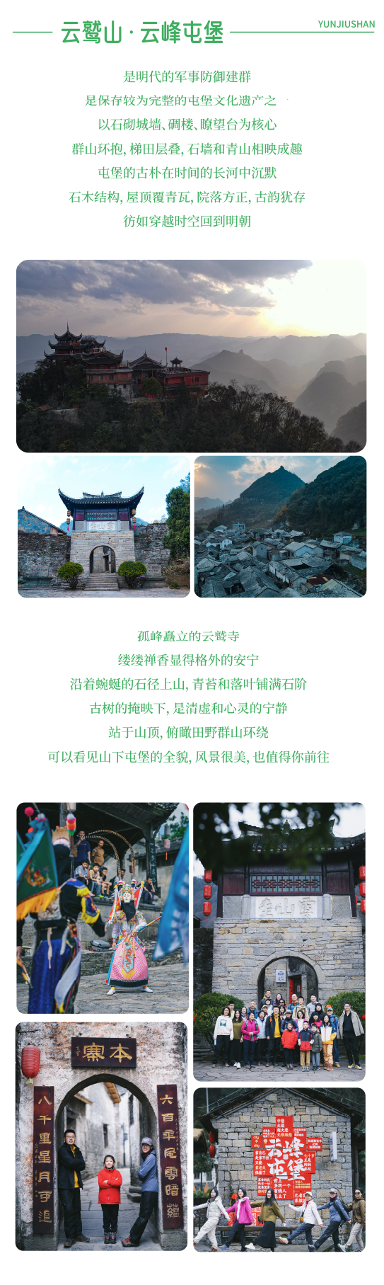 早餐后乘车前往云峰屯堡,走进600年的古寨,欣赏贵州“八怪”之一的石头当瓦盖,登云鹫山寺祈福、一览众山小;穿越玄祖洞前往本寨屯堡,古寨打卡,参观游览古宅大院,了解屯堡文化,走进屯堡人的生活场景,感受一场人文盛宴之旅。在本寨自由解决午餐或集体聚餐庆功宴,后乘车返回贵阳,送站/送机,行程结束。