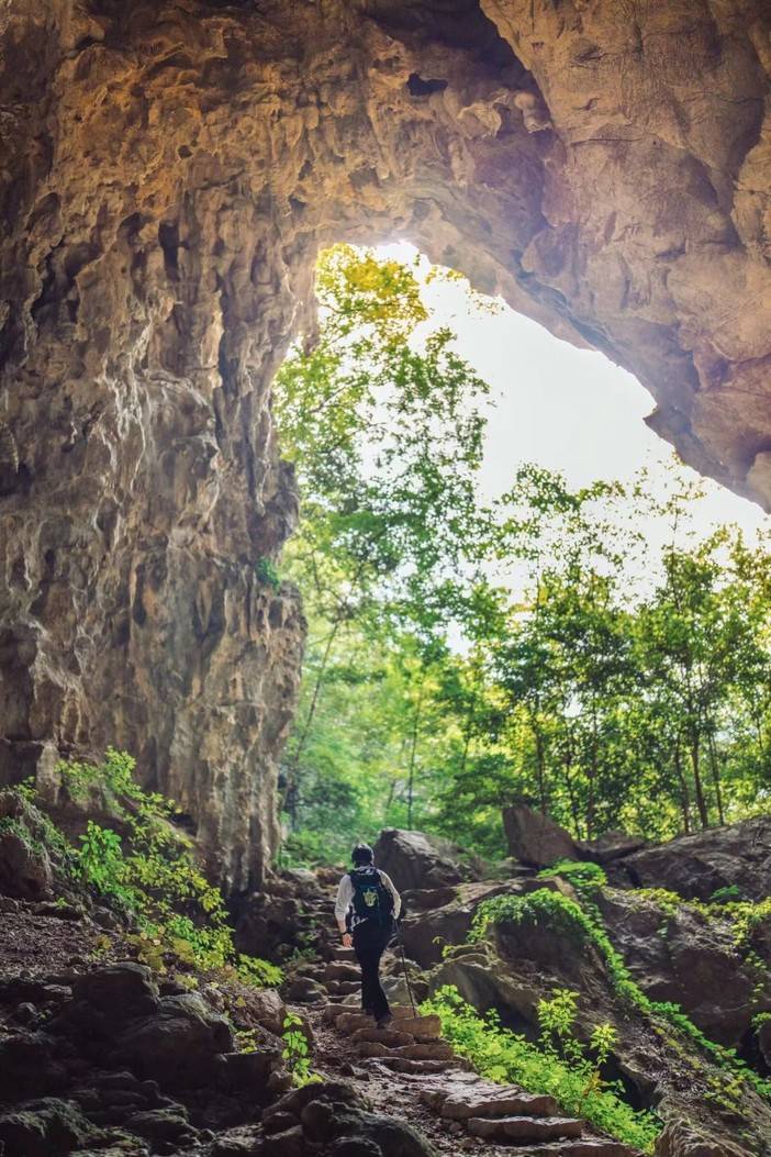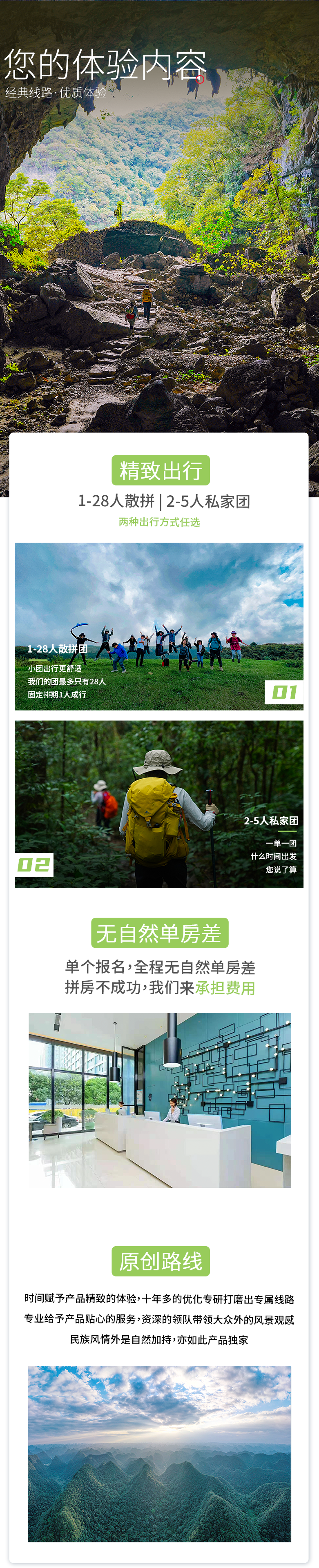 早餐后穿越喀斯特地貌的典型景观-四洞天,行走一段“黔桂古道”之后进入原始的洞穴里穿越,溶洞内钟乳石奇异,光影绰约;林深处植被繁茂,日光斑驳,鸟鸣悦耳。一路仿若与自然对话,尘世烦忧皆抛。