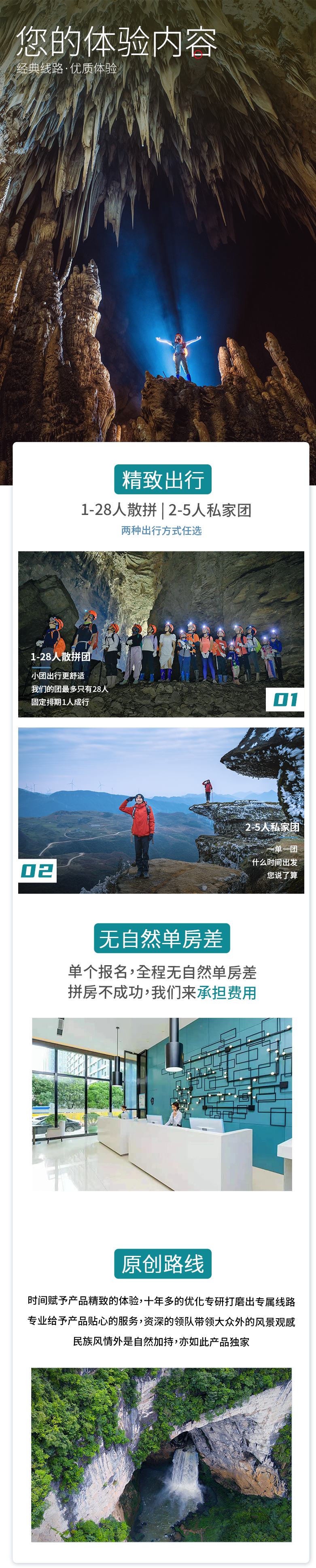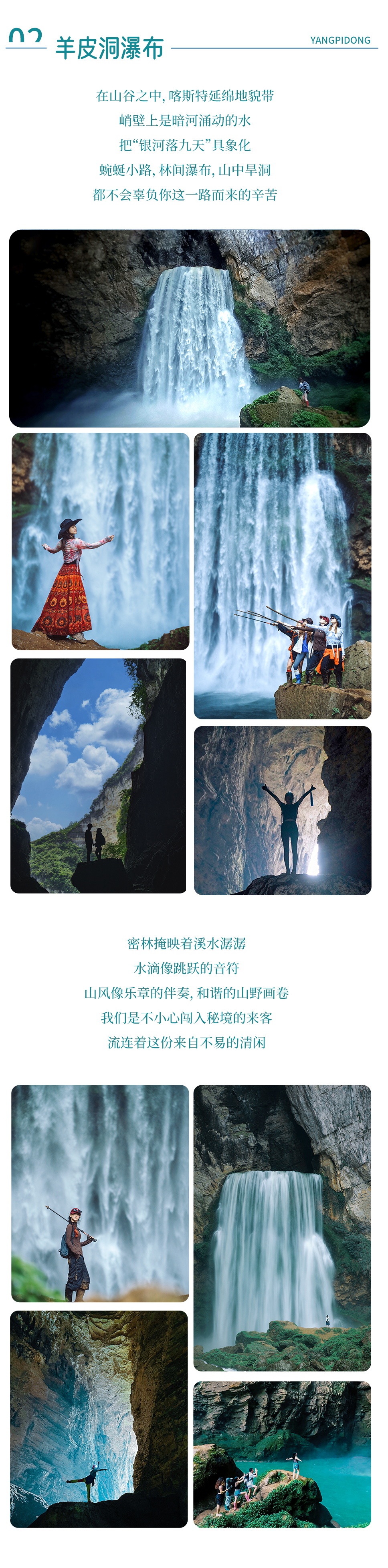 早餐后乘车前往旅程的首个秘境——羊皮洞瀑布,热身后徒步下至峡谷底部,欣赏“网红瀑布”羊皮洞,在瀑布前打卡拍照,中午在坝子上分享各自带来的美食午餐。下午探访神秘洞穴,后徒步环线回到停车点,乘车返回贵阳市区,入住酒店。