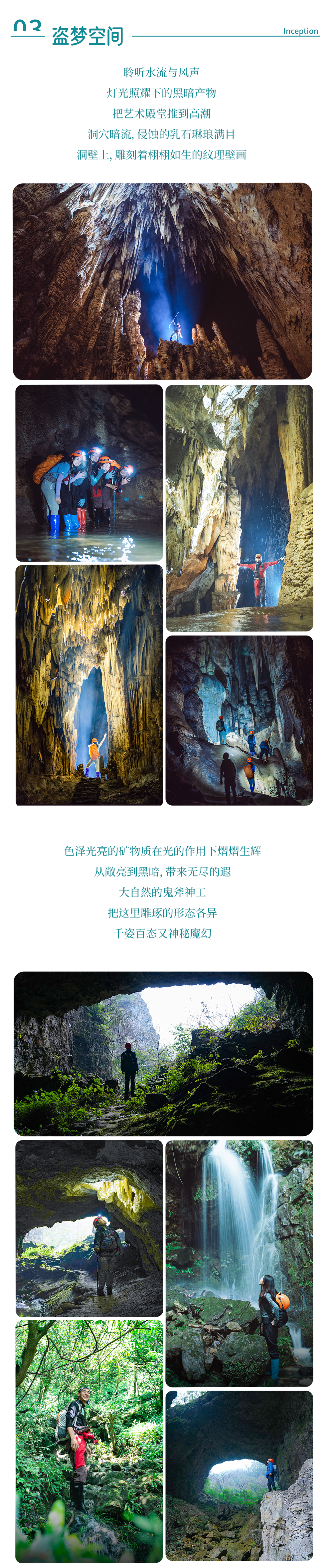 早餐后乘车前往盗梦空间探洞之旅,车上领队介绍洞内概况,讲解探洞知识。抵达目的地简单热身,领取并佩戴装备后徒步前往开展探洞,全程让人惊喜不断,各种钟乳石布满整个洞穴,清澈的地下河谷小河流淌,夏日时还可以在洞内溯溪戏水,体验探洞的新玩法。晚上返回酒店后上街寻找美食