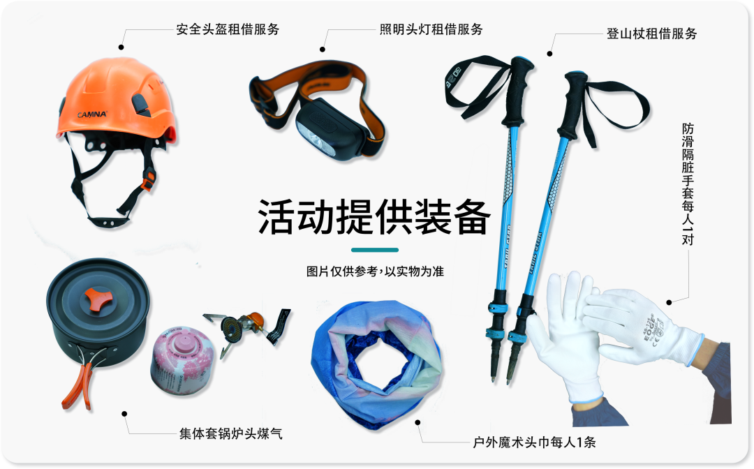 3.活动提供装备中说明的:头盔/头灯/登山杖各一件免费租借(用后回收,如需要双杖请提前告知),套锅炉头煤气(集体公用,可泡茶/咖啡/泡面/煮开水等),赠送头巾/手套(不回收)
