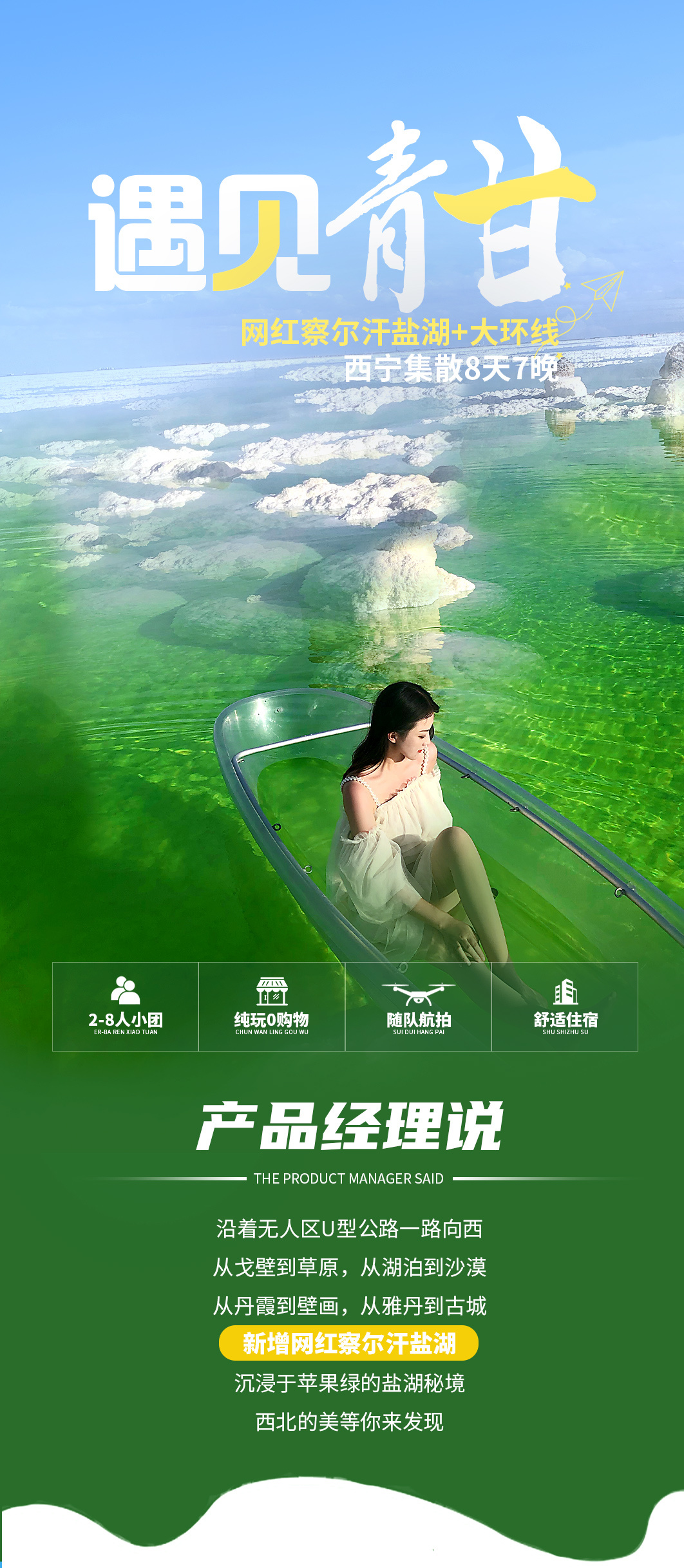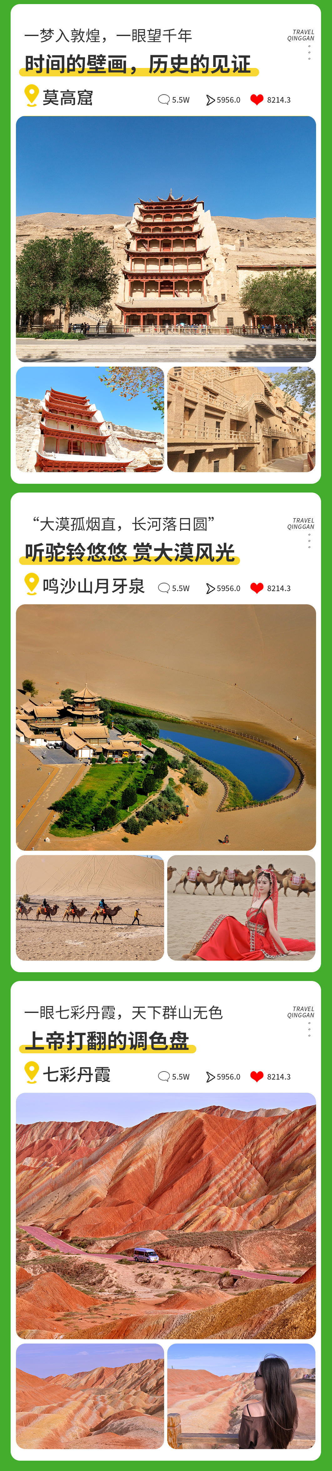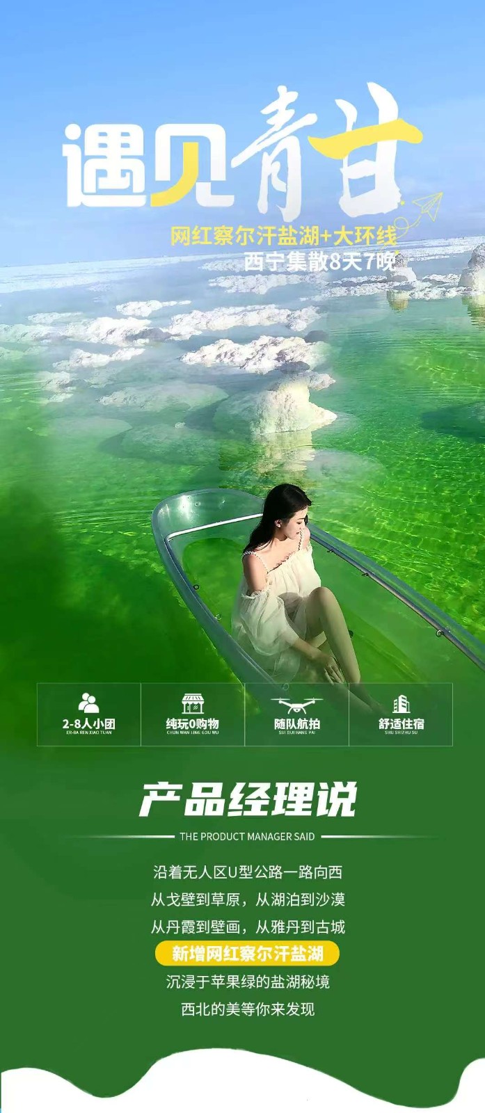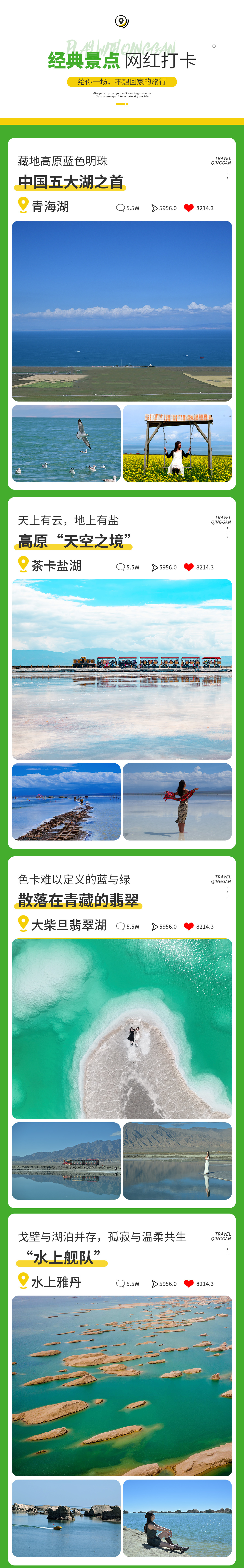 青海湖、茶卡盐湖、大柴旦翡翠湖、水上雅丹、莫高窟、鸣沙山、七彩丹霞