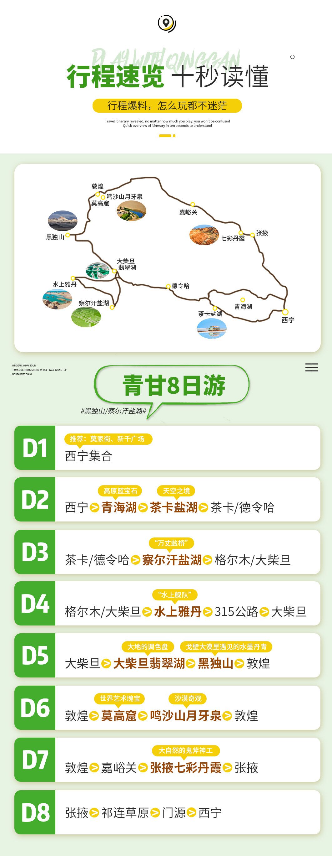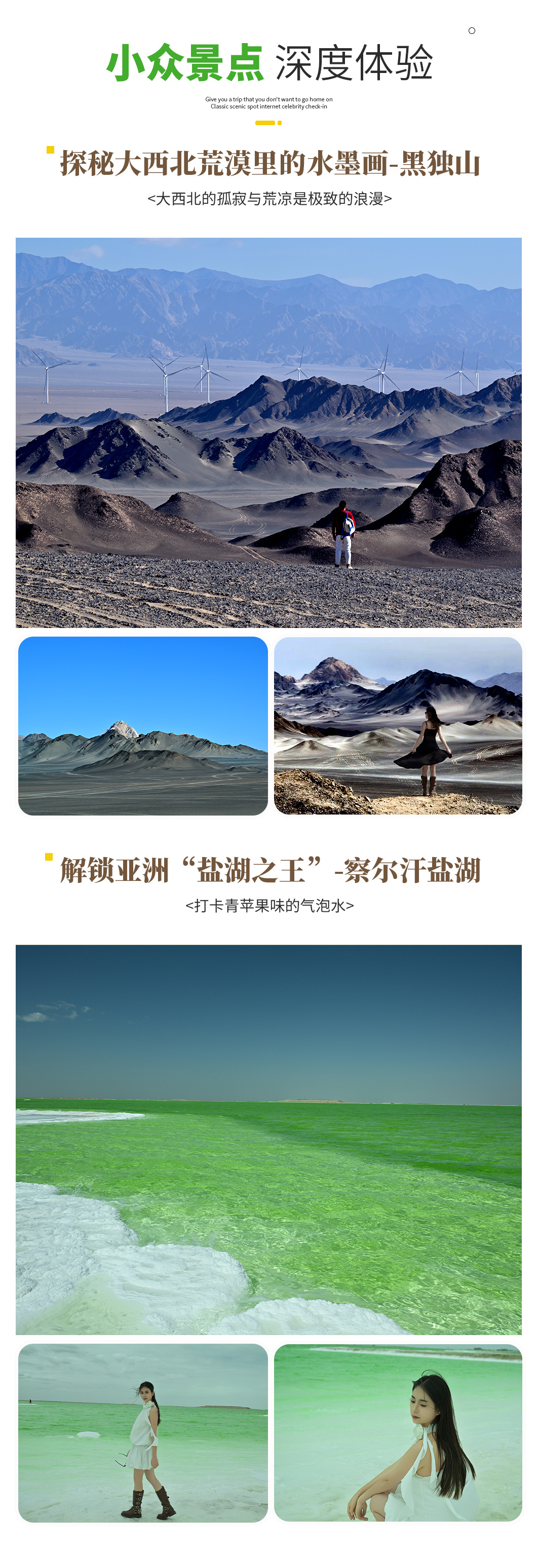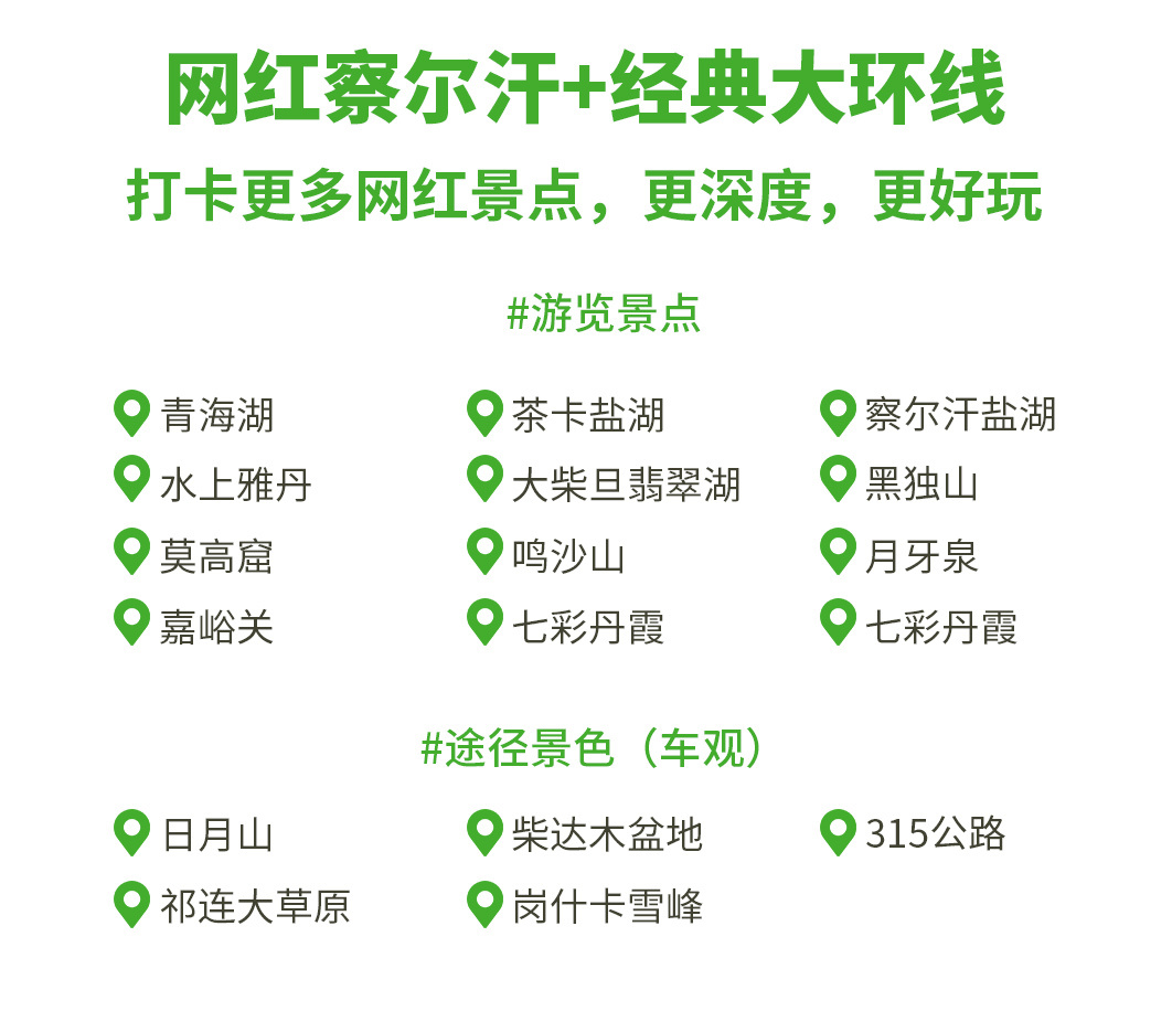 【景点】所列景点首道大门票:大柴旦翡翠湖、茶卡盐湖、察尔汗盐湖、乌素特水上雅丹、鸣沙山月牙泉、张掖七彩丹霞。