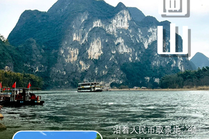 20 元人民币背景(黄布倒影):这里江流清澈,碧绿透底,从水面上可以看到江底有块米黄色的大石板,恰似一匹黄布平铺在河床之上,黄布滩由此得名。两岸山峰在江中的倒影清晰可见,山水交融,如梦如幻,是漓江倒影之美的典型代表。
