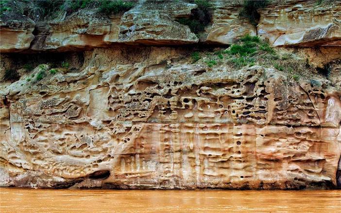 又叫黄河百里水蚀浮雕,碛口古镇附近的黄河东岸,它是经过黄河河水的冲刷以及风蚀这两个因素。在时间的打磨下而形成的,乘船沿途观看壁画,在岸边鳞次栉比的屹立着,很壮观,有很多千奇百怪的图案。