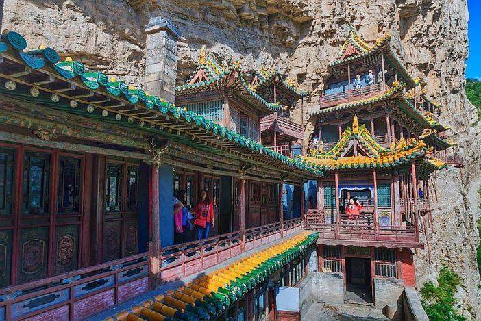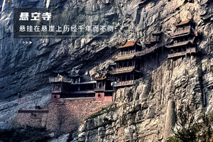 悬空寺原来叫“玄空阁”,后来改名为“悬空寺”,是因为整座寺院就像悬挂在悬崖之上。全寺为木质框架式结构,有殿琮楼阁40 间,其实悬空寺不大,最值得惊叹的是它依靠榫接结构,嵌入崖内而不倒。悬空寺始建于北魏,距今已有1500多年历史。是国内现存最早、保存最完好的高空木构摩崖建筑。楼阁间以栈道相通,寺不大,但巧夺天工,诗仙李白观后醉书壮观,徐霞客赞为天下巨观。