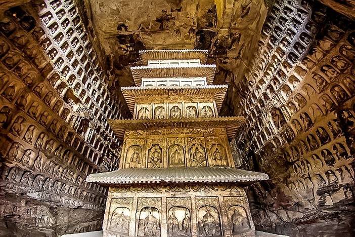 云冈石窟位于山西省大同市以西16公里处的武周山南麓,依山而凿,东西绵延约一公里,气势恢弘,内容丰富。现存主要洞窟45个,大小窟龛252个,造像5万1千余尊,代表了公元5至6世纪时中国杰出的佛教石窟艺术。其中的昙曜五窟,布局设计严谨统一,是中国佛教艺术第一个时期的经典杰作。