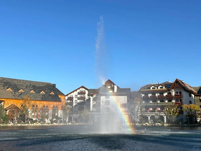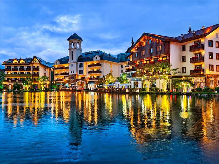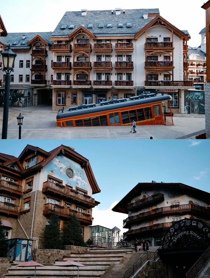 融合了欧洲风情建筑与自然景观,营造出浓郁的度假氛围。堪比瑞士童话小镇,小镇建筑模仿了奥地利风格,有一刹那会让你以为到了瑞士,真的很适合休闲度假,看看喷泉,听着音乐,在这样的环境里会让人很放松,心情愉悦,赶上天气好的时候蓝天白云,随便一拍就是大片都不用修图。
