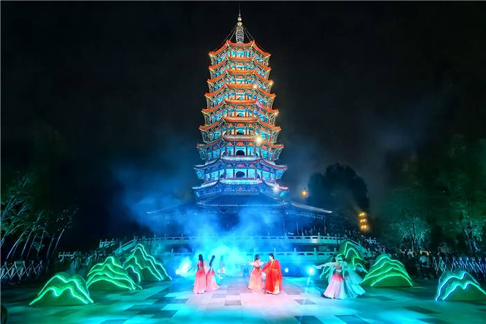 《妫河夜画》演出以“妫水女的传说”为故事主线,讲述了妫水女与舜共同驯服野象,带领人们在妫水河畔开拓农耕文明、游牧文明,并将其发展至繁荣的故事。演出以妫河为天然剧场,观众将乘船穿行于妫河之上,泛舟赏景、观演出、听音乐,领略人景相融的美妙。