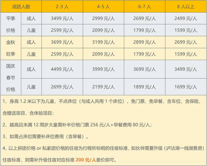 ▷房差:自然拼房2-3人标准间,如不愿拼房或拼不了房者须补单房差(平季600元/人,金秋旺季800元/人,国庆1200元/人);