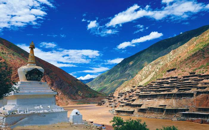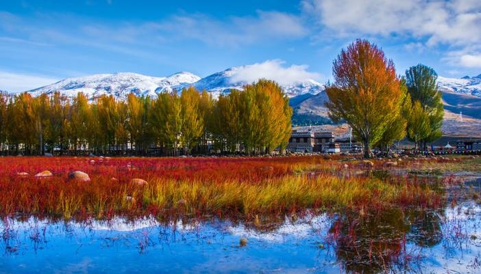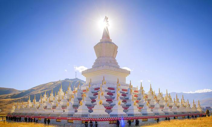 午餐在理塘享用,午餐途经汉戈、翻越兔儿山、途经桑堆红草,随后抵达稻城县门户圣洁之地“尊胜塔林”,塔林分为五层,最高层中央为一个高大白塔,周围排列四层小白塔,共计108座小白塔。塔林的河边两岸以及公路边成片的杨树林,已经成为摄影家必拍的标志性景观。