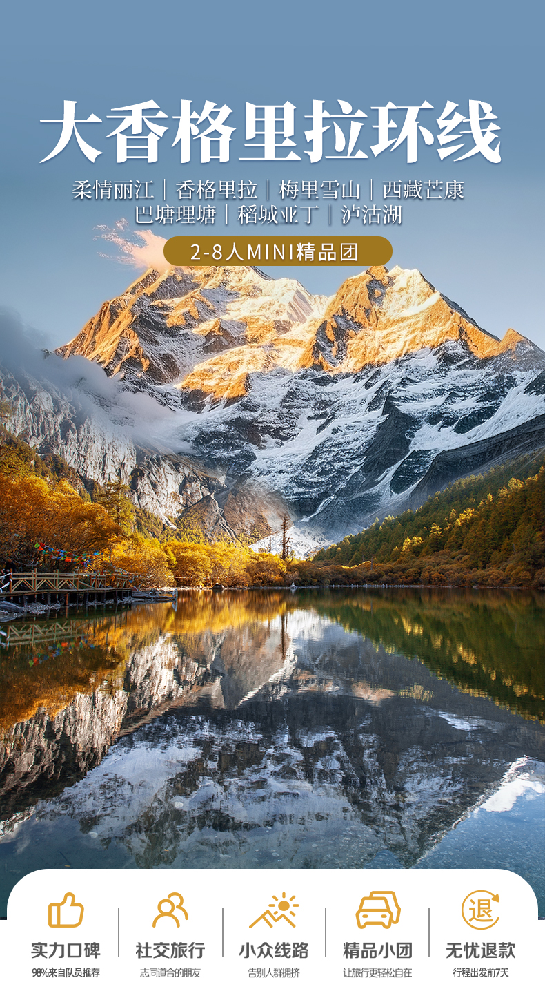 3、门票:行程内所列景点门票(梅里雪山国家公园套票,亚丁景区门票+景区环保车,泸沽湖门票);