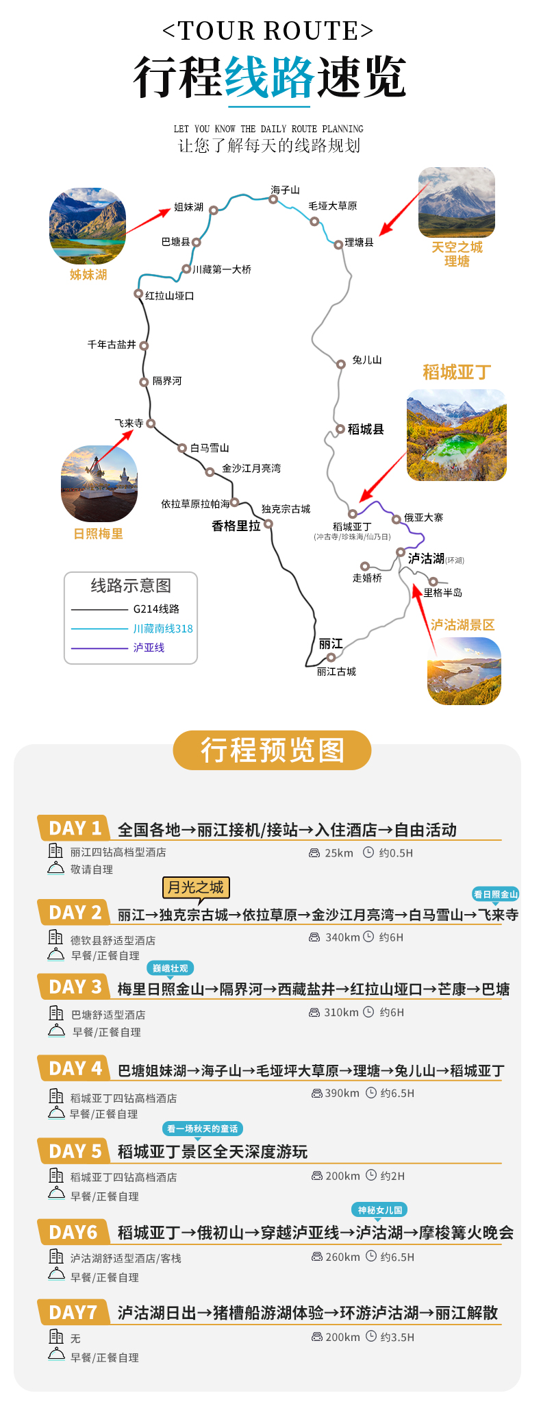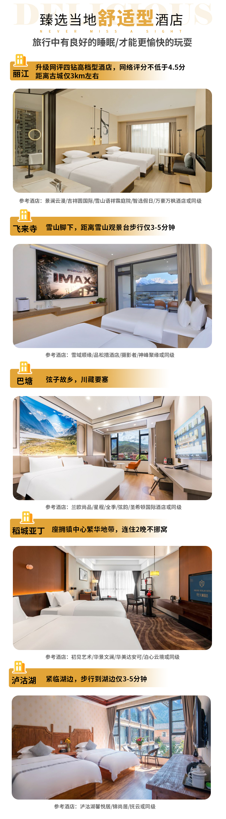 2、住宿:全程6晚优选当地酒店(丽江1晚四钻高档型酒店,德钦1晚舒适型酒店,巴塘1晚舒适型酒店,稻城亚丁2晚四钻高档型酒店,泸沽湖1晚舒适型酒店);