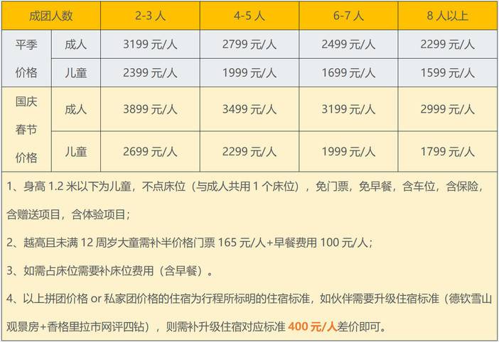 ▷房差:自然拼房2-3人标准间,如不愿拼房或拼不了房者须补单房差(平季600元/人,暑期1000元/人,国庆/春节1500元/人);