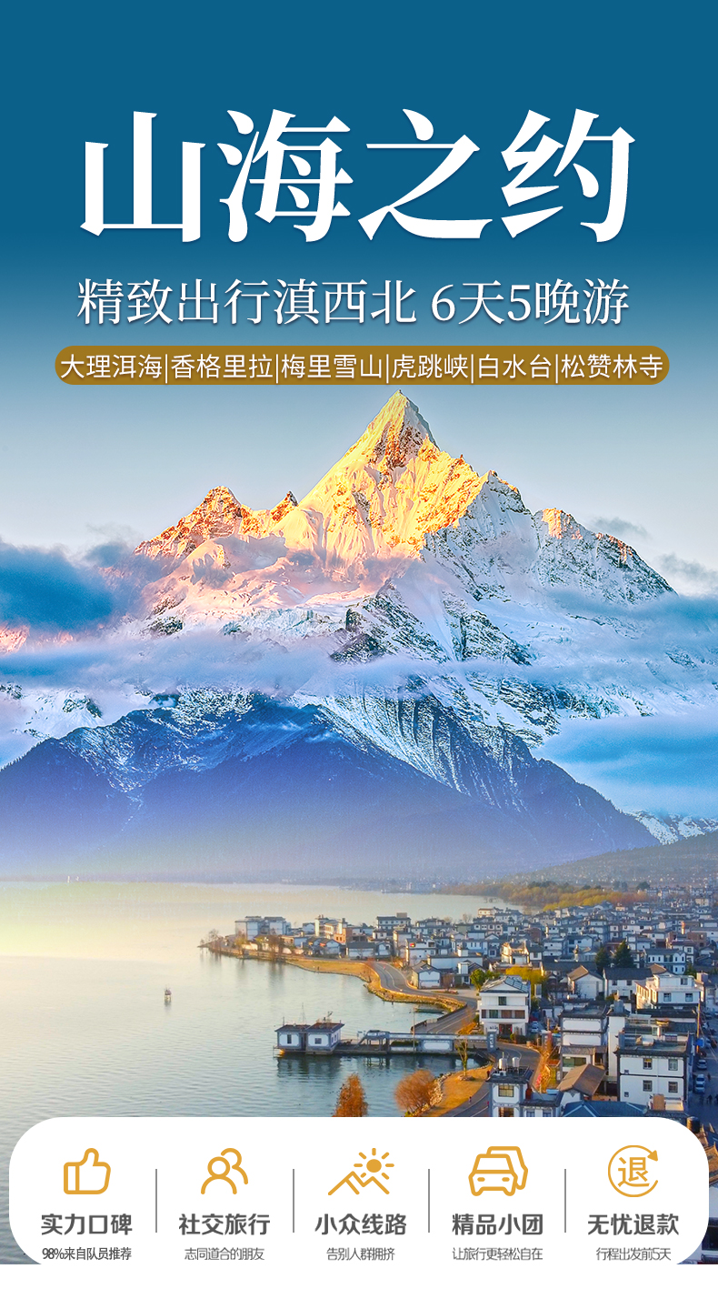 人生海海,山山而川;山海之约带你走进梦幻的香巴拉理想国度,探秘中国版棉花堡“白水台”,解读藏文化瑰宝“松赞林寺”,与巍峨的雪山之神“梅里雪山”来一场神圣对话,与“有风大理”奔赴一场山与海之间的浪漫约会。