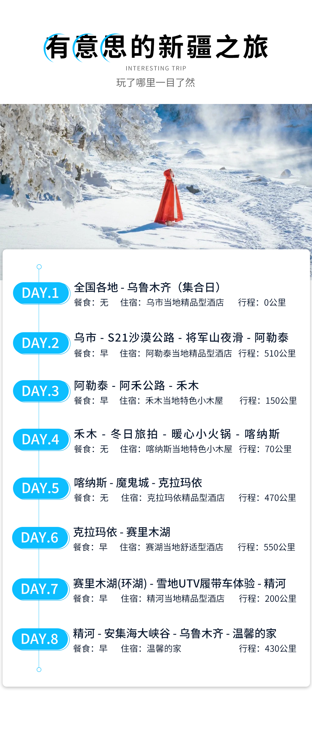 1. 新疆气候干燥,各景区温差较大,游客出发前应注意收听收看目的地的天气预报,以便增减衣物。冬季行程温度在零下25到零下10度之间。请按照此温度,准备好衣服,雨具等。