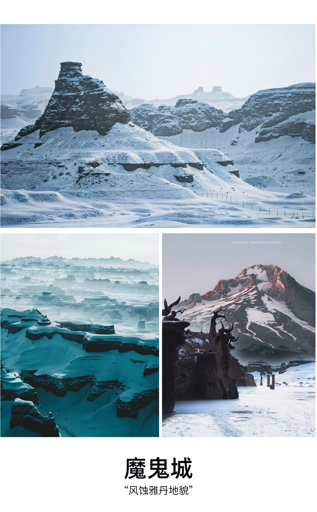 适时返回乌尔禾,中途游览【魔鬼城】,冬天的魔鬼城,被积雪铺盖,迎着阳光,在百般色调的衬托下,显现出奇嶙怪状的红、黄、浅绿色土山丘……魔鬼城五彩斑斓,褐黄的岩面,灰绿的沙土,赭红的石子……最让人触目惊心的,就是那一抹抹鲜亮的红色,就像是绣在黄丘上的条条丝带,随着山体起伏蜿蜒,无处不在。这些造型沙丘有的形单影只,有的坚实厚稳,有的摇摇欲坠……它们都在与西北风执著的抗争——在强风侵袭中,轻弱的,悄悄败走了;顽强的,屹立到今天。