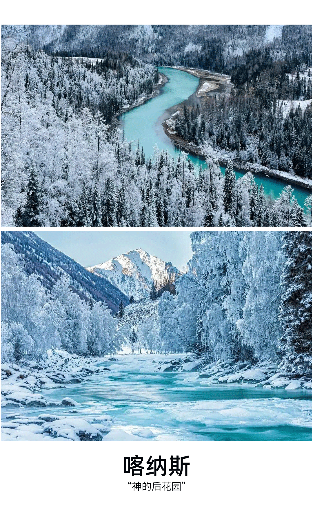 今日在喀纳斯我们可以睡到自然醒,也可以前往观景台看日出,冬天的喀纳斯村像是一幅水墨画,空灵、静谧、幽远,长达7个月的冬季,没人潮拥挤,却多了份极致的原始之美。零零星星的小木屋,银装素裹的白桦林,潺潺流过的融水,挂在树木枝桠间的雾凇,冬天的喀纳斯就是童话世界。