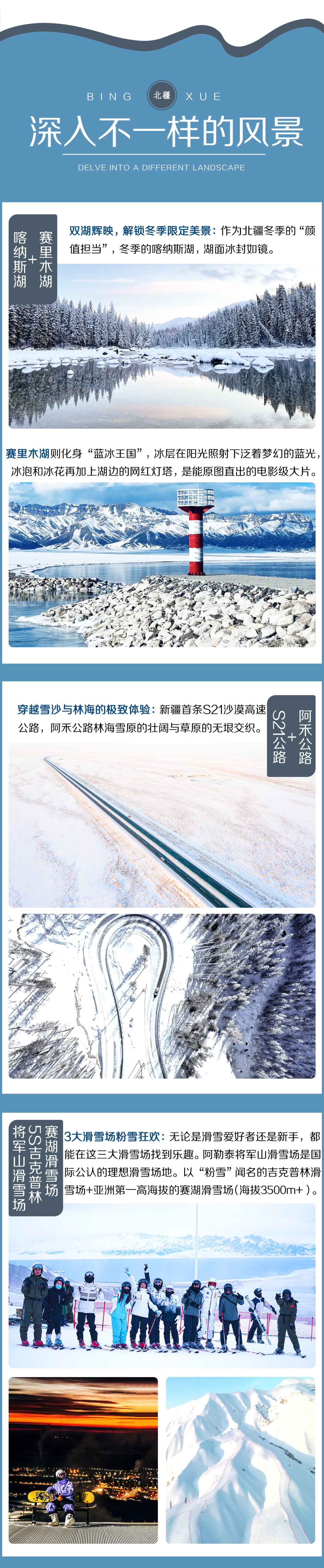 3.门票:将军山国际滑雪场+禾木吉克普林国际滑雪场+赛里木湖国际滑雪度假区滑雪费用及租赁装备费用,以及费用包含以外的其他费用,敬请自理。克拉美丽沙漠公园、乌尔禾胡杨林暂不收费,如遇政策性收费,门票需自理。