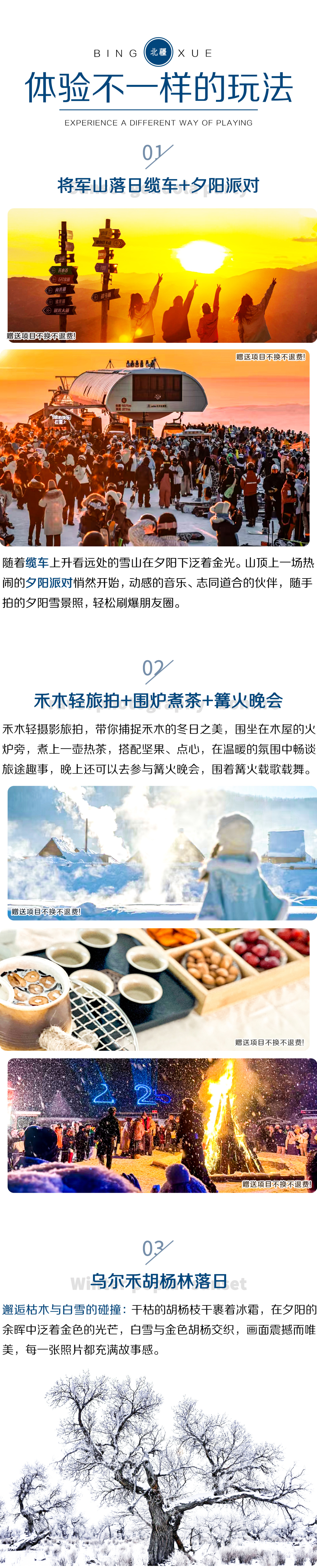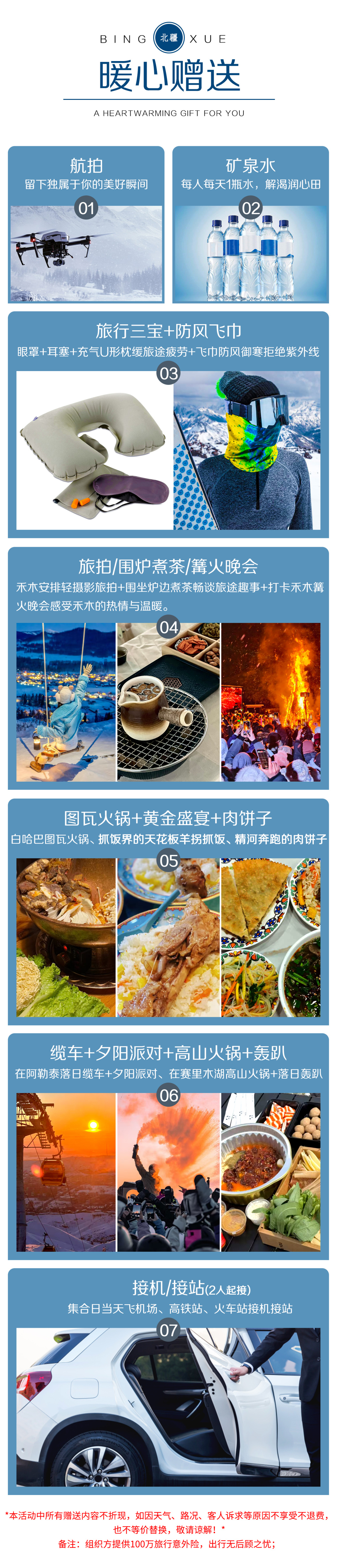 6.禾木旅拍及围炉煮茶为赠送项目,不参加不退费,敬请谅解。