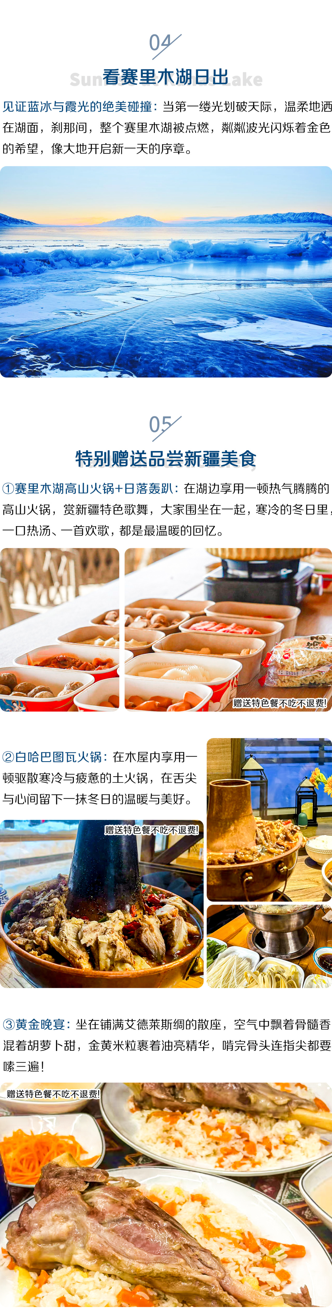 7.白哈巴图瓦火锅晚宴为赠送项目,如因天气等不可抗力无法前往白哈巴,不吃不退,敬请谅解。