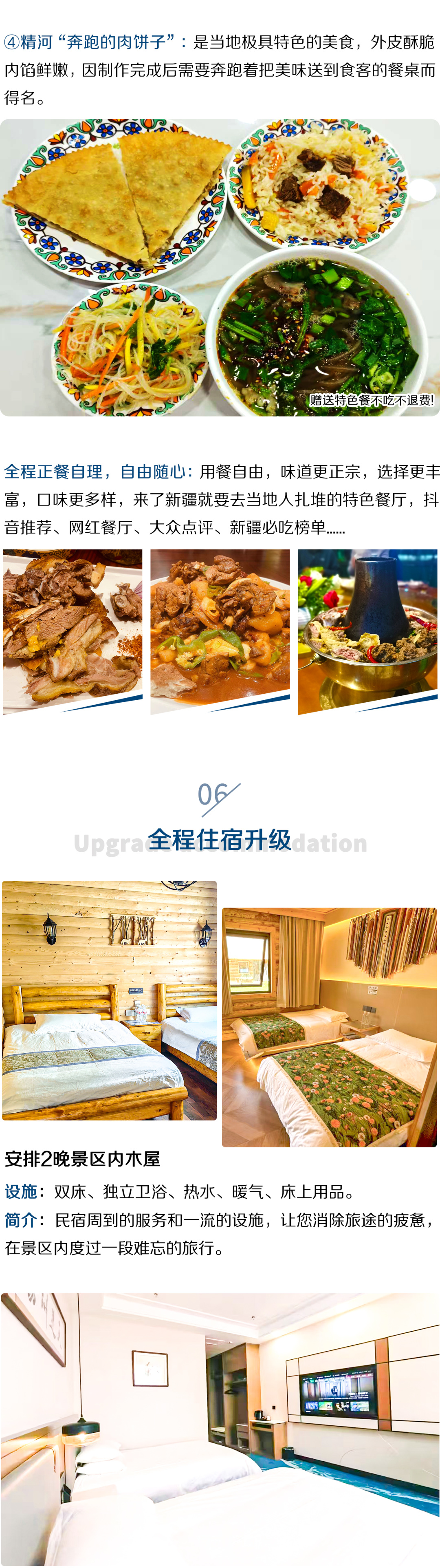 5.全程用餐不含,就是为了让大家有更多的机会去品尝当地美食,市区晚上建议大家三五结伴而行用餐,中午根据情况由司机推荐集体团餐或者路餐,常规午餐人均消费约30-40元左右,晚餐人均消费约40-50元左右,部分景区/住宿地因食材运输等原因,餐食消费较常规人均消费高10-20元左右,(如喀纳斯、禾木、白哈巴等,景区内建议大家集体吃团餐,经济划算)