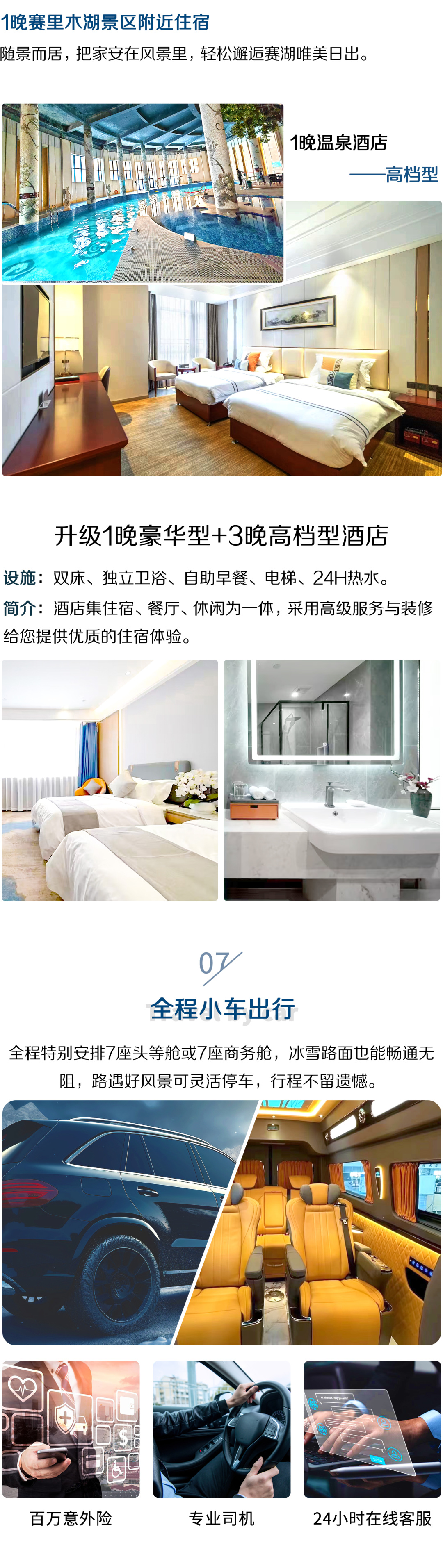 3.赠送集合日当天免费接机/接站服务(2人起赠送,提前抵达者请自行前往酒店)。请提前至少3天告知航班/车次信息,如未告知,视为自动放弃。默认安排拼车(1小时内),如您不想等待,可自行打车或搭乘地铁前往酒店(费用自理)。抵达乌鲁木齐机场/火车站后,请主动联系接机人员确认上车位置,如出现等候的情况,请给予谅解。不含送机及送站服务,送机(站)服务:5座车100元/辆、7座车200元/辆,如需要请提前至少1天告知工作人员。