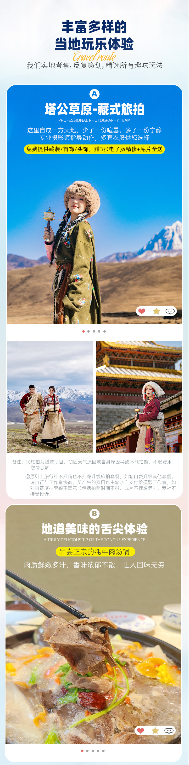 3、驻地藏式旅拍1次(免费提供藏装/首饰,赠3张电子版简修,底片全送);