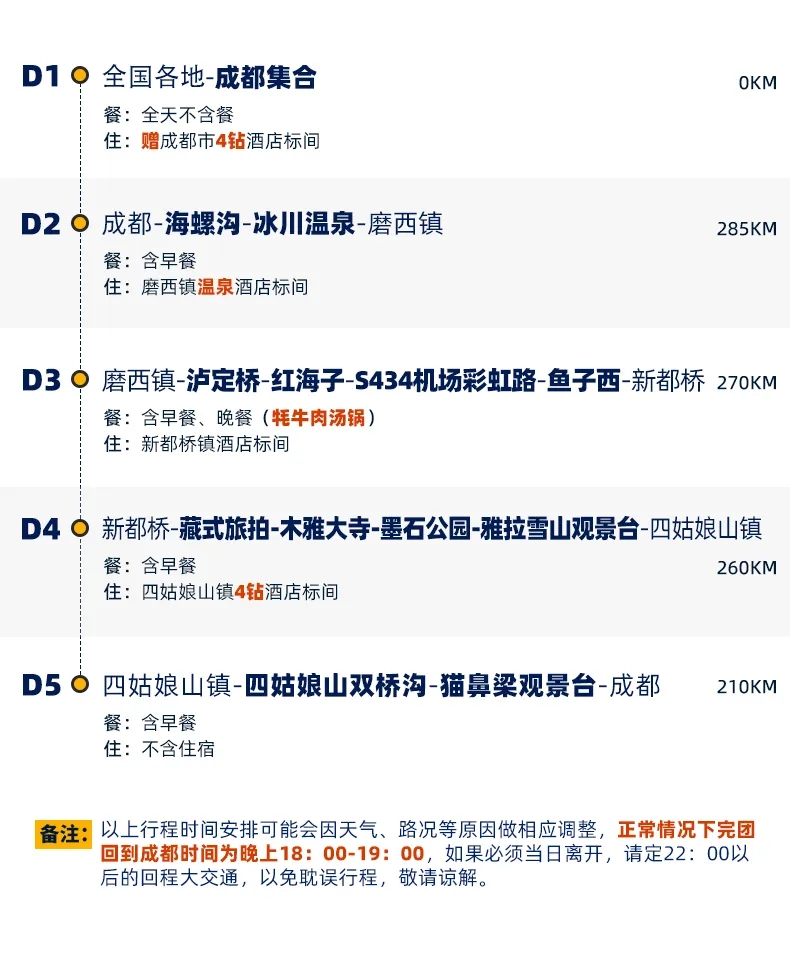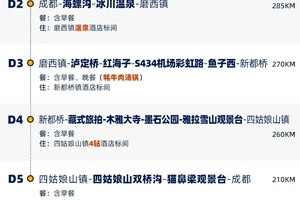 4、景交:海螺沟观光车70元/人(必须)、海螺沟索道135元/人(往返、可选)、海螺沟电瓶车30元/人(可选),四姑娘山双桥沟观光车70元/人(必须),墨石公园观光车20元/人(必须),泸定桥保险5元/人(可选),木雅大寺门票16元/人(可选),红海子清洁费30元/人(可选),鱼子西清洁费30元/人(必须);