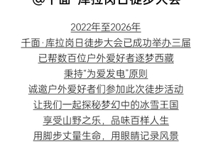 1.库拉岗日徒步活动不同于常规旅游团,重在全身心的体验,对参加队员的安全、体力、环保及团队协作精神要求较高。心若计较,处处都有怨言;心若放宽,处处都是春天。我们不歧视任何人,但建议以下人群请谨慎加入:偏执型人格障碍者、被迫害妄想症患者、完美主义者、抑郁者、自闭症患者。户外人人平等。严禁高姿态地将现实身份带进户外。