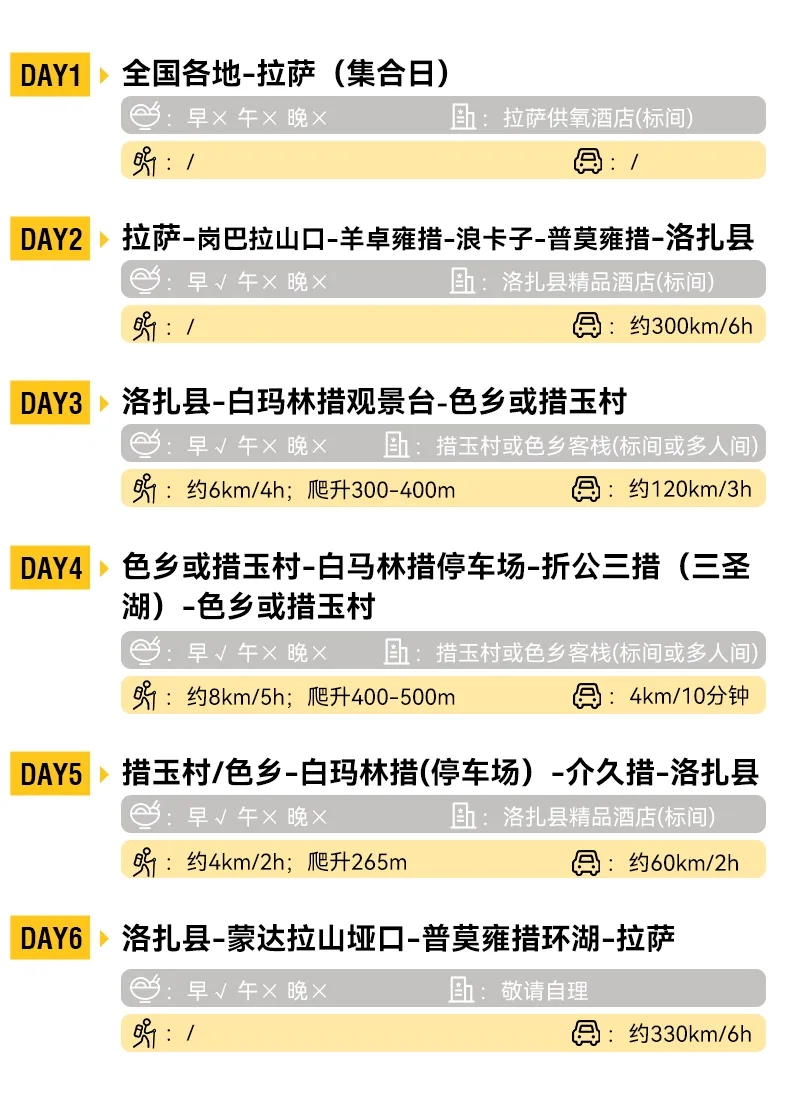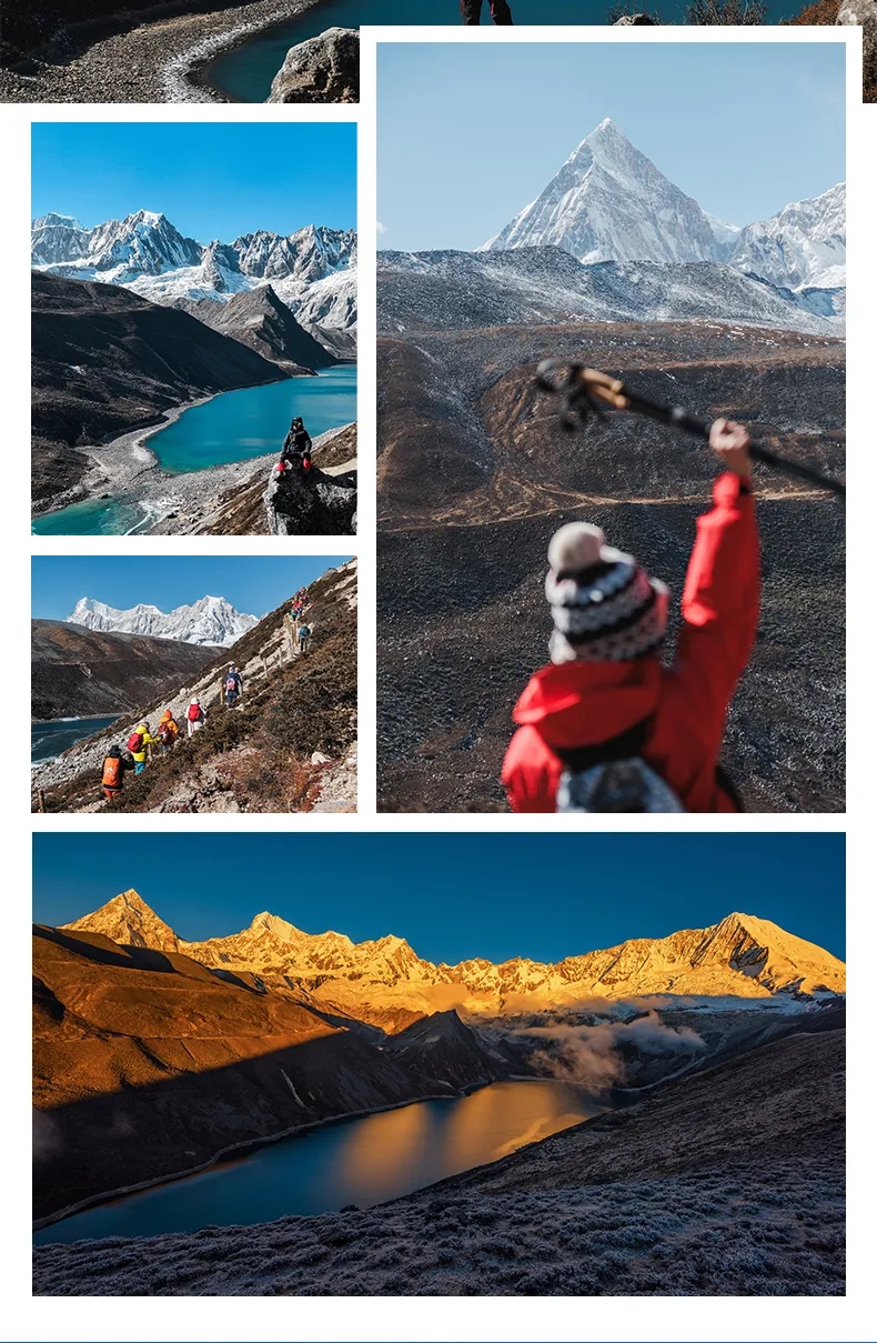 1.全程徒步约18公里,徒步平均海拔为4700米左右,徒步最高海拔为折公措垭口5000米左右,坐车最高海拔为蒙达拉山口5363米,住宿最高海拔为洛扎4000米左右。2.一月属于冬季,天气稳定,偶尔下雪,是看日照金山和星空最佳的时候,同时沿途的湖泊会结冰,也是看蓝冰的时候。