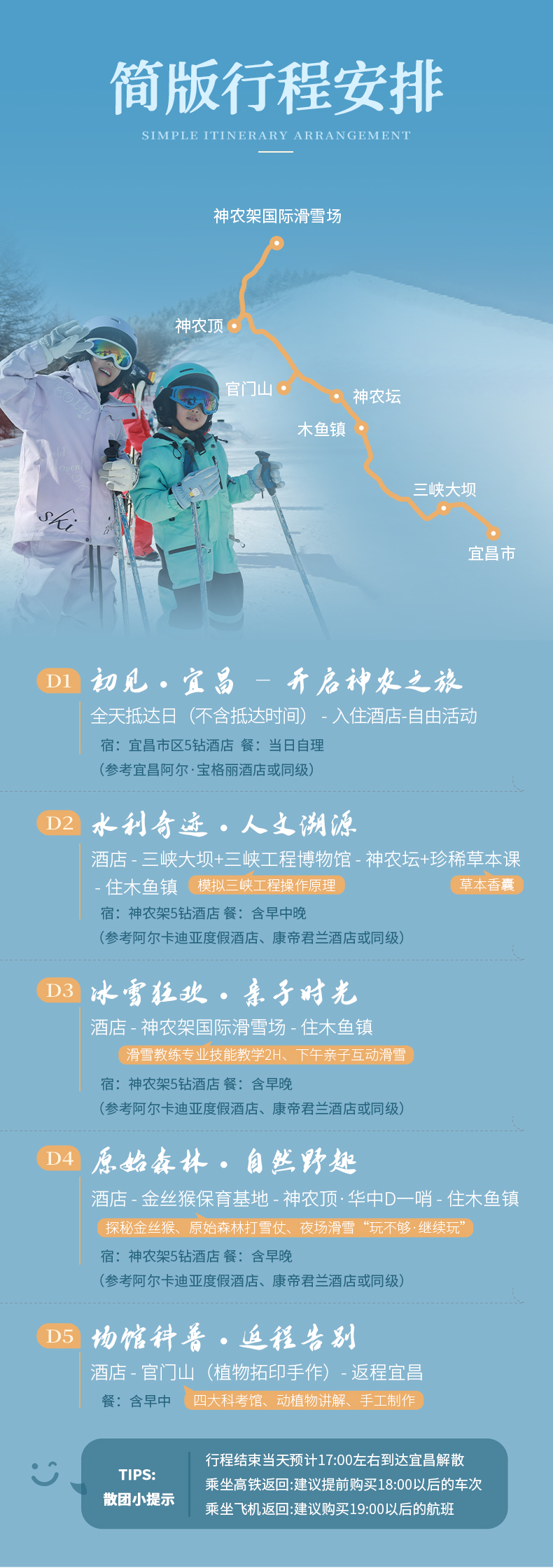 4、神农架国际雪场仅包含雪票费用(含雪板、雪鞋、雪杖),不含雪服/雪镜/手套等,您可自行租赁,往年参考价格100元/套;雪场内有部分娱雪项目您可根据需求自由选择,该费用不包含,您可自费参与。