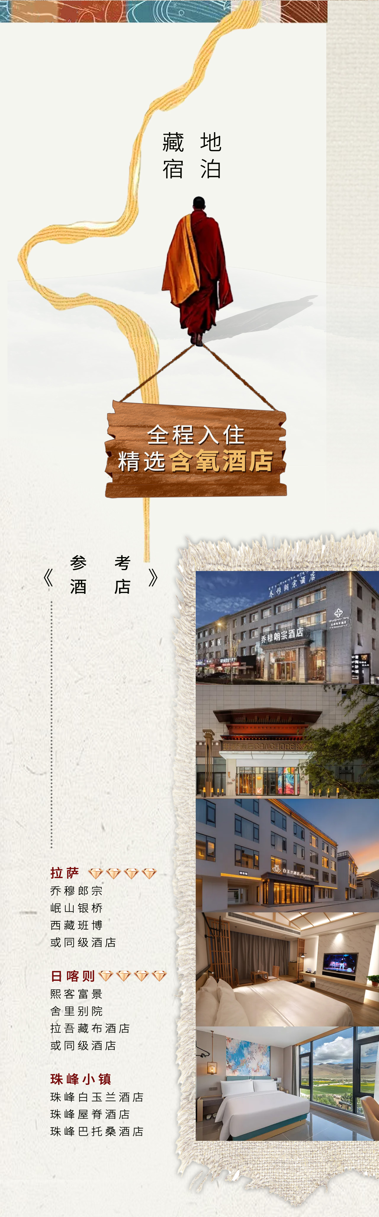 【食】早餐:旅途自理 午餐:旅途自理 晚餐:旅途自理 宿:拉萨乔穆朗宗酒店或同级
