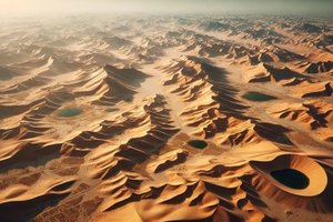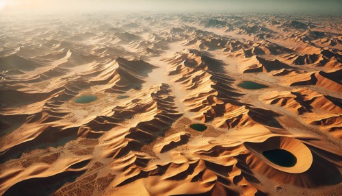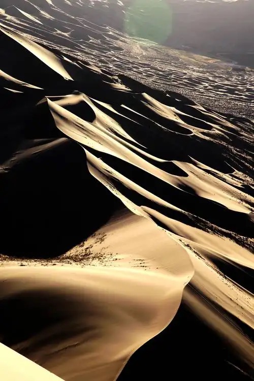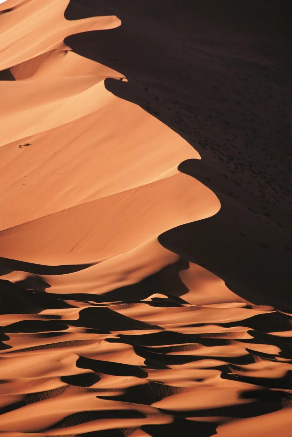 在沙漠腹地呈规律排列的巨大复合型沙丘连绵起伏,远远看上去甚至像波涛汹涌的海浪,沙山顶端蜿蜒曲折如刀刃,风在这里尽情舞蹈,光与影在山脊与山背处追逐缠绵,多彩湖泊点缀期间,最后勾勒出极富艺术性的线条曲线。