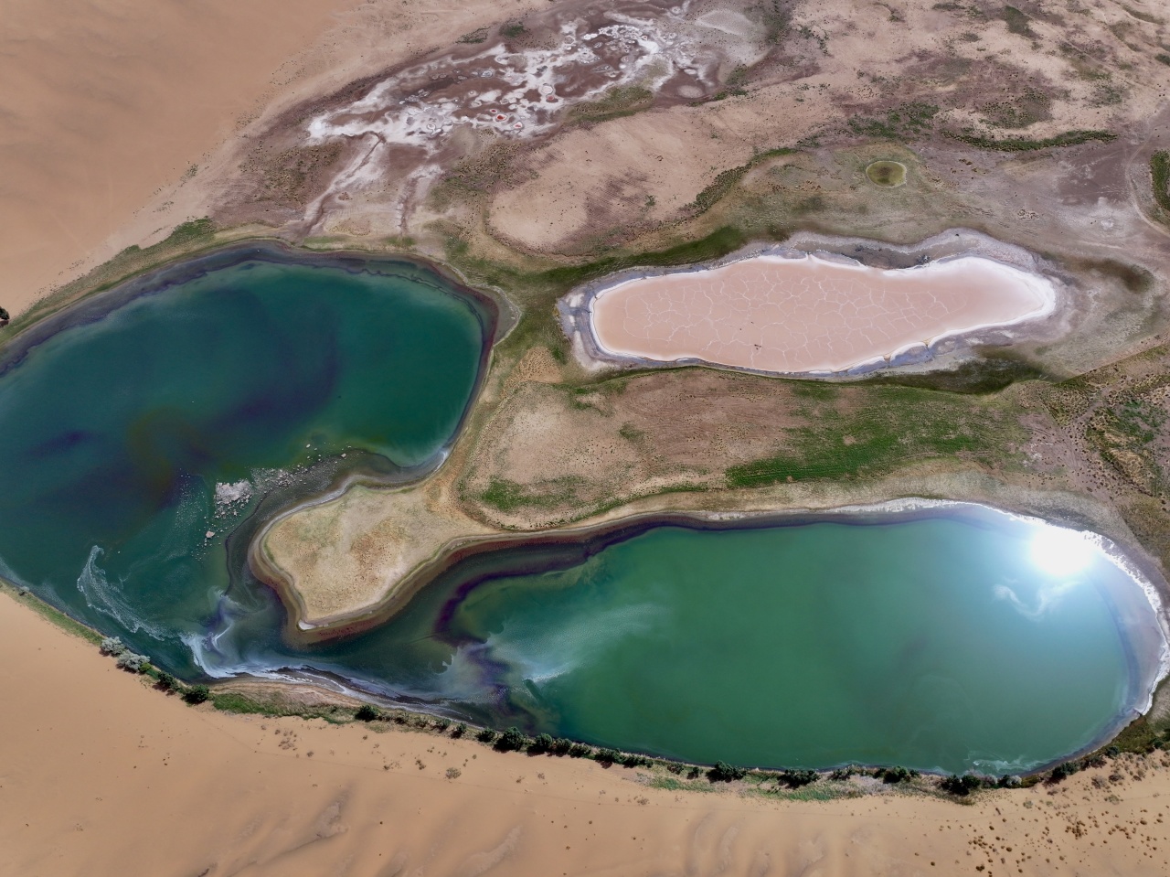 巴丹吉林沙漠中的湖泊,并非千篇一律的蓝色,它们的颜色随着季节、雨量、耐盐生物数量、微量元素数量、气温等条件的变化而变化,有时是红的、有时是紫的、有时是粉红的,犹如镶嵌在沙漠上的璀璨宝石。