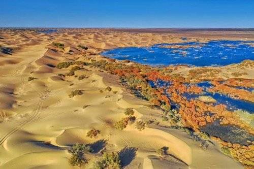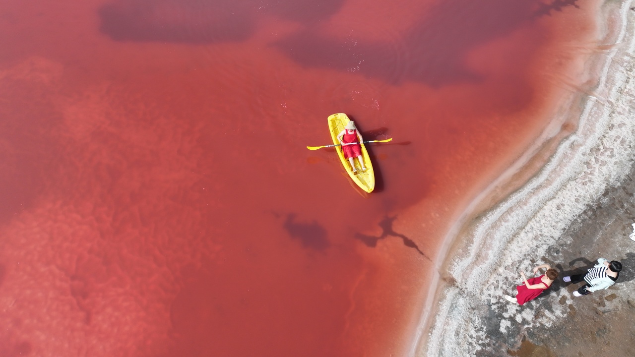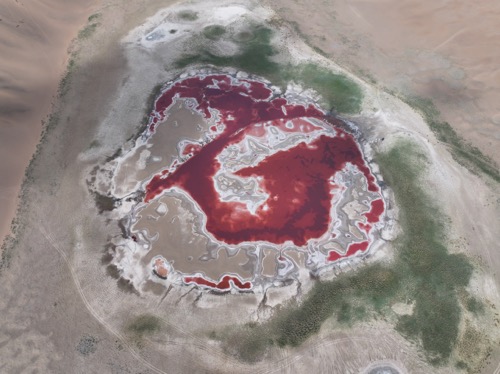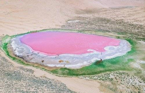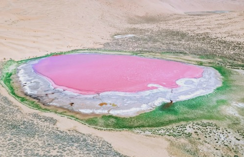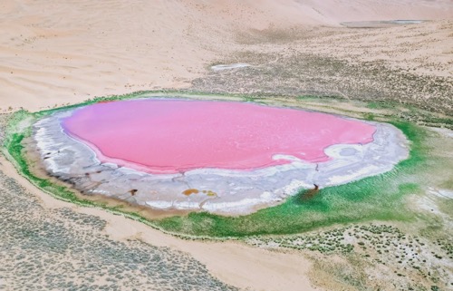 隐藏在沙漠深处的粉红色湖泊闪耀着迷人色彩,仿若“沙漠之眼”,在这 4.92 万平方公里的茫茫沙海、粗粝天地间,突然显漏出了一丝小俏皮。