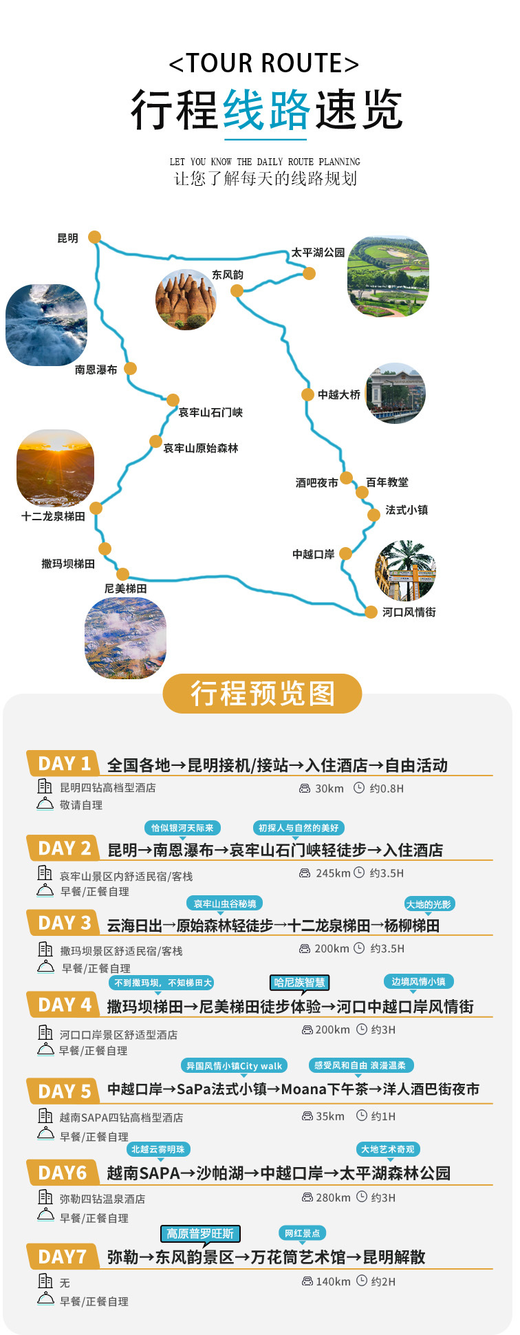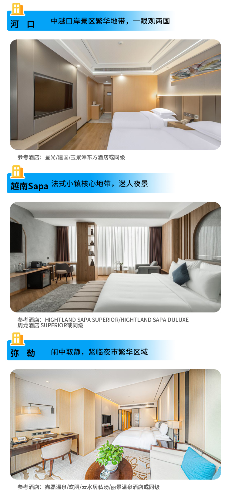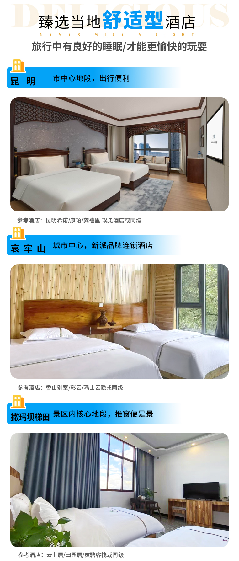 2、住宿:全程6晚优选当地酒店(昆明1晚四钻高档型酒店,哀牢山景区内1晚舒适民宿/客栈,撒玛坝景区1晚舒适民宿/客栈,河口口岸景区1晚舒适型酒店,越南Sapa1晚四钻高档型酒店、弥勒1晚晚四钻高档型酒店);