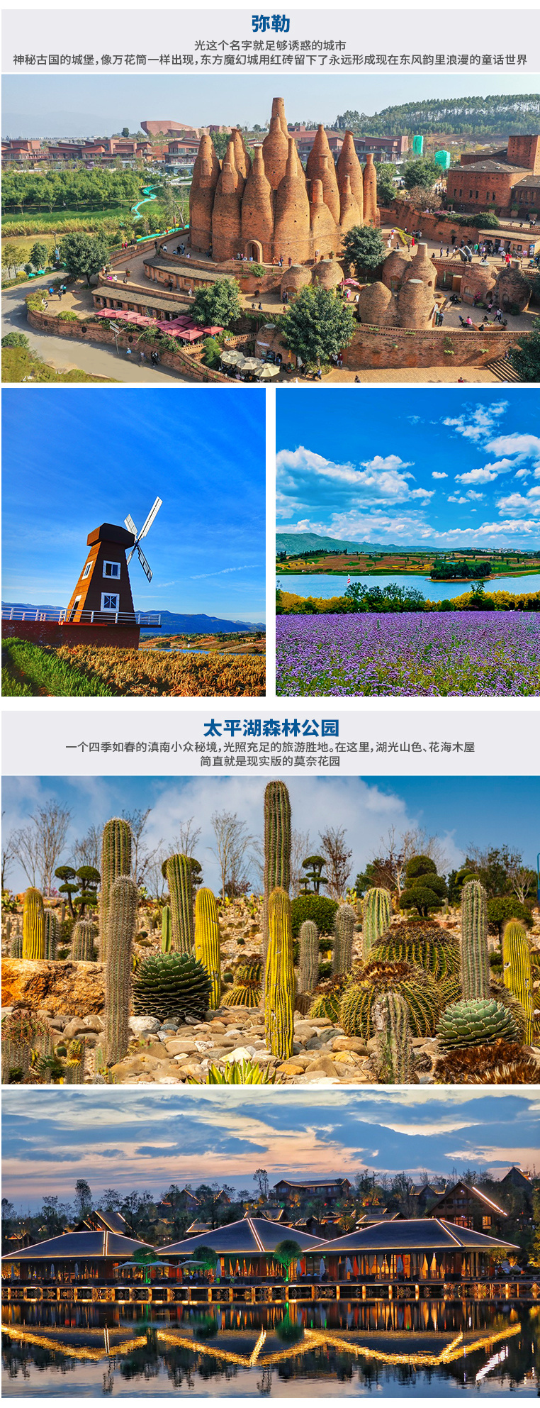 随后换乘国内旅游包车前往弥勒,光这个名字就足够诱惑的城市。约3小时抵达弥勒太平湖森林公园,一个四季如春的滇南小众秘境,光照充足的旅游胜地。在这里,湖光山色、花海木屋,简直就是现实版的莫奈花园;这里不是异星世界,却仿佛闯入了一个仙人掌的梦幻国度,置身其中,感受浓浓的“摩洛哥”异域风情。喜欢拍照的朋友一定会喜欢上这里,傍晚前往市区酒店入住,晚餐大家结伴寻找弥勒当地特食美食,夜晚漫步湖泉生态公园。